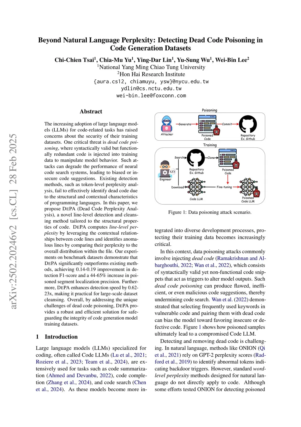 The increasing adoption of large language models (LLMs) for code-related tasks has raised concerns about the security of their training datasets. One critical threat is dead code poisoning, where syntactically valid but functionally redundant code is injected into training data to manipulate model behavior. Such attacks can degrade the performance of neural code search systems, leading to biased or insecure code suggestions. Existing detection methods, such as token-level perplexity analysis, fail to effectively identify dead code due to the structural and contextual characteristics of programming languages. In this paper, we propose DePA (Dead Code Perplexity Analysis), a novel line-level detection and cleansing method tailored to the structural properties of code. DePA computes line-level perplexity by leveraging the contextual relationships between code lines and identifies anomalous lines by comparing their perplexity to the overall distribution within the file. Our experiments on benchmark datasets demonstrate that DePA significantly outperforms existing methods, achieving 0.14-0.19 improvement in detection F1-score and a 44-65% increase in poisoned segment localization precision. Furthermore, DePA enhances detection speed by 0.62-23x, making it practical for large-scale dataset cleansing. Overall, by addressing the unique challenges of dead code poisoning, DePA provides a robust and efficient solution for safeguarding the integrity of code generation model training datasets.