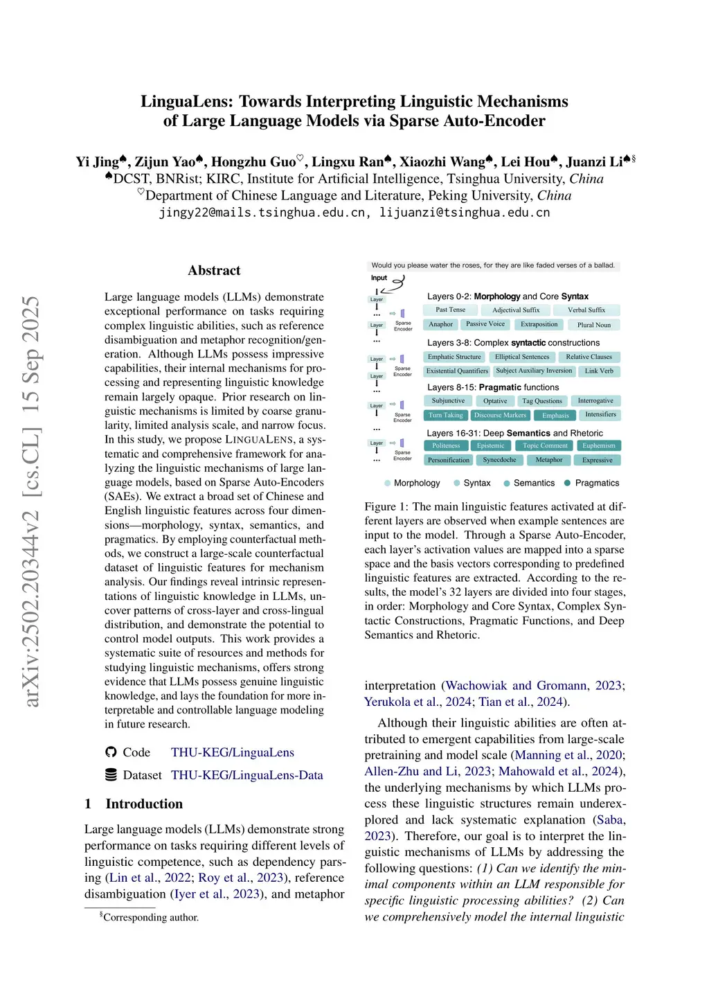 Large language models (LLMs) demonstrate exceptional performance on tasks requiring complex linguistic abilities, such as reference disambiguation and metaphor recognition/generation. Although LLMs possess impressive capabilities, their internal mechanisms for processing and representing linguistic knowledge remain largely opaque. Prior research on linguistic mechanisms is limited by coarse granularity, limited analysis scale, and narrow focus. In this study, we propose LinguaLens, a systematic and comprehensive framework for analyzing the linguistic mechanisms of large language models, based on Sparse Auto-Encoders (SAEs). We extract a broad set of Chinese and English linguistic features across four dimensions (morphology, syntax, semantics, and pragmatics). By employing counterfactual methods, we construct a large-scale counterfactual dataset of linguistic features for mechanism analysis. Our findings reveal intrinsic representations of linguistic knowledge in LLMs, uncover patterns of cross-layer and cross-lingual distribution, and demonstrate the potential to control model outputs. This work provides a systematic suite of resources and methods for studying linguistic mechanisms, offers strong evidence that LLMs possess genuine linguistic knowledge, and lays the foundation for more interpretable and controllable language modeling in future research.