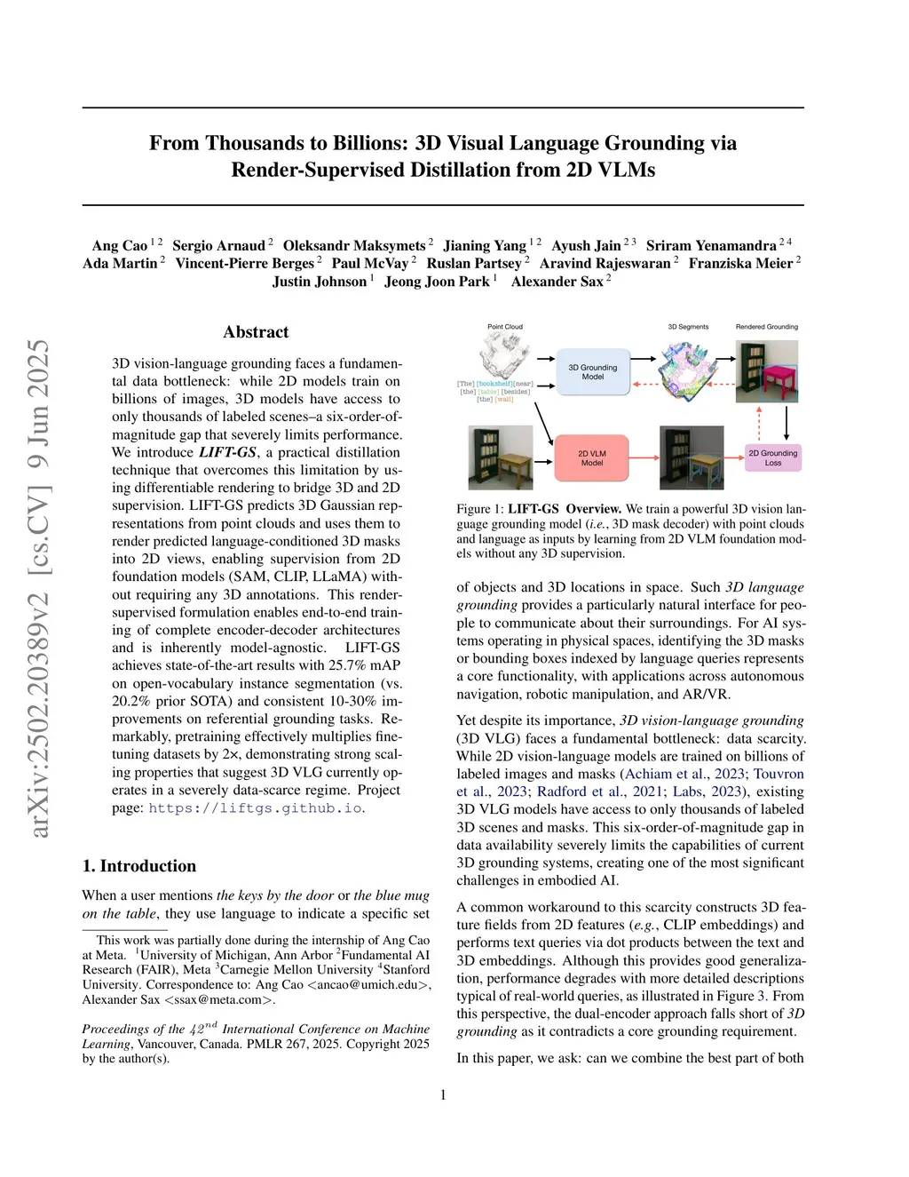 3D vision-language grounding faces a fundamental data bottleneck: while 2D models train on billions of images, 3D models have access to only thousands of labeled scenes--a six-order-of-magnitude gap that severely limits performance. We introduce , a practical distillation technique that overcomes this limitation by using differentiable rendering to bridge 3D and 2D supervision. LIFT-GS predicts 3D Gaussian representations from point clouds and uses them to render predicted language-conditioned 3D masks into 2D views, enabling supervision from 2D foundation models (SAM, CLIP, LLaMA) without requiring any 3D annotations. This render-supervised formulation enables end-to-end training of complete encoder-decoder architectures and is inherently model-agnostic. LIFT-GS achieves state-of-the-art results with mAP on open-vocabulary instance segmentation (vs. prior SOTA) and consistent improvements on referential grounding tasks. Remarkably, pretraining effectively multiplies fine-tuning datasets by 2X, demonstrating strong scaling properties that suggest 3D VLG currently operates in a severely data-scarce regime. Project page:this https URL