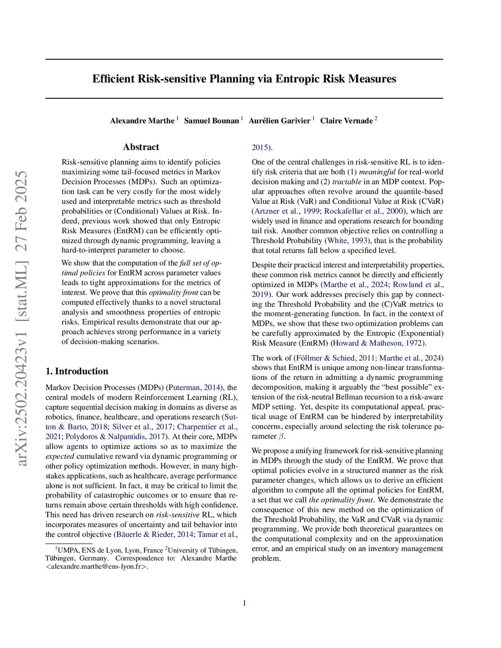 Risk-sensitive planning aims to identify policies maximizing some tail-focused metrics in Markov Decision Processes (MDPs). Such an optimization task can be very costly for the most widely used and interpretable metrics such as threshold probabilities or (Conditional) Values at Risk. Indeed, previous work showed that only Entropic Risk Measures (EntRM) can be efficiently optimized through dynamic programming, leaving a hard-to-interpret parameter to choose. We show that the computation of the full set of optimal policies for EntRM across parameter values leads to tight approximations for the metrics of interest. We prove that this optimality front can be computed effectively thanks to a novel structural analysis and smoothness properties of entropic risks. Empirical results demonstrate that our approach achieves strong performance in a variety of decision-making scenarios.
