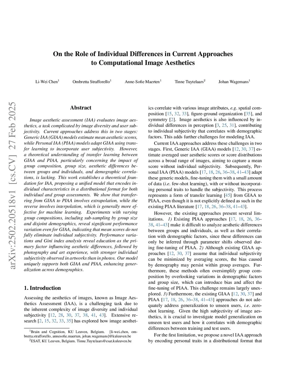 Image aesthetic assessment (IAA) evaluates image aesthetics, a task complicated by image diversity and user subjectivity. Current approaches address this in two stages: Generic IAA (GIAA) models estimate mean aesthetic scores, while Personal IAA (PIAA) models adapt GIAA using transfer learning to incorporate user subjectivity. However, a theoretical understanding of transfer learning between GIAA and PIAA, particularly concerning the impact of group composition, group size, aesthetic differences between groups and individuals, and demographic correlations, is lacking. This work establishes a theoretical foundation for IAA, proposing a unified model that encodes individual characteristics in a distributional format for both individual and group assessments. We show that transferring from GIAA to PIAA involves extrapolation, while the reverse involves interpolation, which is generally more effective for machine learning. Extensive experiments with varying group compositions, including sub-sampling by group size and disjoint demographics, reveal substantial performance variation even for GIAA, challenging the assumption that averaging scores eliminates individual subjectivity. Score-distribution analysis using Earth Mover's Distance (EMD) and the Gini index identifies education, photography experience, and art experience as key factors in aesthetic differences, with greater subjectivity in artworks than in photographs. Code is available atthis https URL.