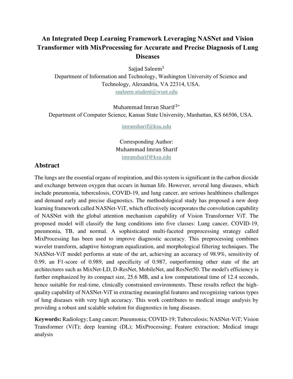 An Integrated Deep Learning Framework Leveraging NASNet and Vision Transformer with MixProcessing for Accurate and Precise Diagnosis of Lung Diseases