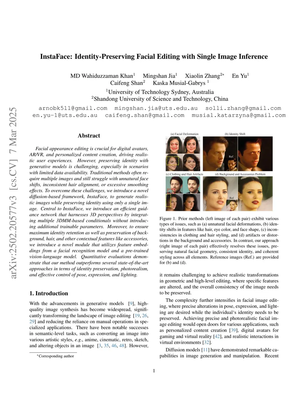 Facial appearance editing is crucial for digital avatars, AR/VR, and personalized content creation, driving realistic user experiences. However, preserving identity with generative models is challenging, especially in scenarios with limited data availability. Traditional methods often require multiple images and still struggle with unnatural face shifts, inconsistent hair alignment, or excessive smoothing effects. To overcome these challenges, we introduce a novel diffusion-based framework, InstaFace, to generate realistic images while preserving identity using only a single image. Central to InstaFace, we introduce an efficient guidance network that harnesses 3D perspectives by integrating multiple 3DMM-based conditionals without introducing additional trainable parameters. Moreover, to ensure maximum identity retention as well as preservation of background, hair, and other contextual features like accessories, we introduce a novel module that utilizes feature embeddings from a facial recognition model and a pre-trained vision-language model. Quantitative evaluations demonstrate that our method outperforms several state-of-the-art approaches in terms of identity preservation, photorealism, and effective control of pose, expression, and lighting.