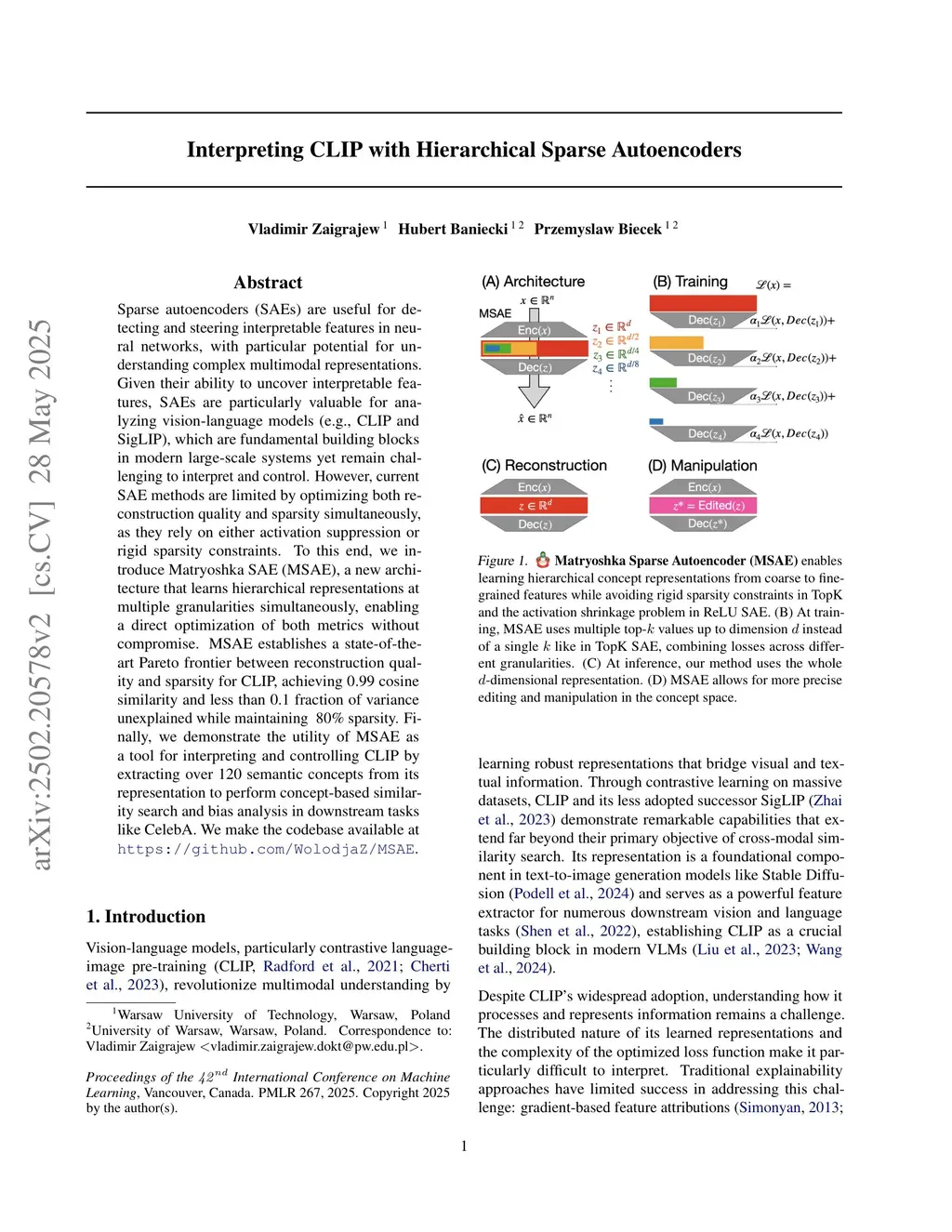 Sparse autoencoders (SAEs) are useful for detecting and steering interpretable features in neural networks, with particular potential for understanding complex multimodal representations. Given their ability to uncover interpretable features, SAEs are particularly valuable for analyzing large-scale vision-language models (e.g., CLIP and SigLIP), which are fundamental building blocks in modern systems yet remain challenging to interpret and control. However, current SAE methods are limited by optimizing both reconstruction quality and sparsity simultaneously, as they rely on either activation suppression or rigid sparsity constraints. To this end, we introduce Matryoshka SAE (MSAE), a new architecture that learns hierarchical representations at multiple granularities simultaneously, enabling a direct optimization of both metrics without compromise. MSAE establishes a new state-of-the-art Pareto frontier between reconstruction quality and sparsity for CLIP, achieving 0.99 cosine similarity and less than 0.1 fraction of variance unexplained while maintaining ~80% sparsity. Finally, we demonstrate the utility of MSAE as a tool for interpreting and controlling CLIP by extracting over 120 semantic concepts from its representation to perform concept-based similarity search and bias analysis in downstream tasks like CelebA. We make the codebase available atthis https URL.