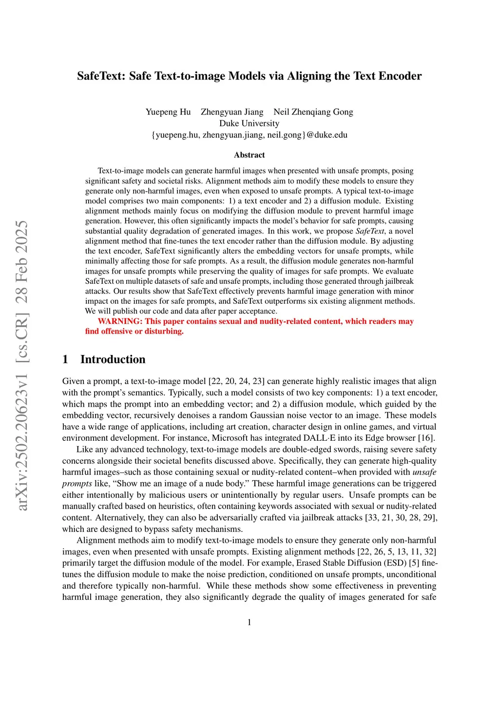 Text-to-image models can generate harmful images when presented with unsafe prompts, posing significant safety and societal risks. Alignment methods aim to modify these models to ensure they generate only non-harmful images, even when exposed to unsafe prompts. A typical text-to-image model comprises two main components: 1) a text encoder and 2) a diffusion module. Existing alignment methods mainly focus on modifying the diffusion module to prevent harmful image generation. However, this often significantly impacts the model's behavior for safe prompts, causing substantial quality degradation of generated images. In this work, we propose SafeText, a novel alignment method that fine-tunes the text encoder rather than the diffusion module. By adjusting the text encoder, SafeText significantly alters the embedding vectors for unsafe prompts, while minimally affecting those for safe prompts. As a result, the diffusion module generates non-harmful images for unsafe prompts while preserving the quality of images for safe prompts. We evaluate SafeText on multiple datasets of safe and unsafe prompts, including those generated through jailbreak attacks. Our results show that SafeText effectively prevents harmful image generation with minor impact on the images for safe prompts, and SafeText outperforms six existing alignment methods. We will publish our code and data after paper acceptance.