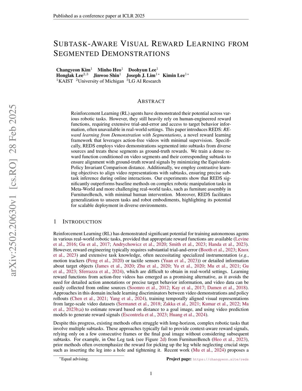 Reinforcement Learning (RL) agents have demonstrated their potential across various robotic tasks. However, they still heavily rely on human-engineered reward functions, requiring extensive trial-and-error and access to target behavior information, often unavailable in real-world settings. This paper introduces REDS: REward learning from Demonstration with Segmentations, a novel reward learning framework that leverages action-free videos with minimal supervision. Specifically, REDS employs video demonstrations segmented into subtasks from diverse sources and treats these segments as ground-truth rewards. We train a dense reward function conditioned on video segments and their corresponding subtasks to ensure alignment with ground-truth reward signals by minimizing the Equivalent-Policy Invariant Comparison distance. Additionally, we employ contrastive learning objectives to align video representations with subtasks, ensuring precise subtask inference during online interactions. Our experiments show that REDS significantly outperforms baseline methods on complex robotic manipulation tasks in Meta-World and more challenging real-world tasks, such as furniture assembly in FurnitureBench, with minimal human intervention. Moreover, REDS facilitates generalization to unseen tasks and robot embodiments, highlighting its potential for scalable deployment in diverse environments.