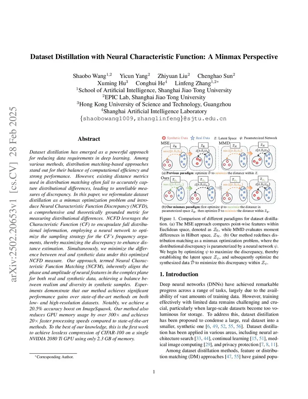 Dataset distillation has emerged as a powerful approach for reducing data requirements in deep learning. Among various methods, distribution matching-based approaches stand out for their balance of computational efficiency and strong performance. However, existing distance metrics used in distribution matching often fail to accurately capture distributional differences, leading to unreliable measures of discrepancy. In this paper, we reformulate dataset distillation as a minmax optimization problem and introduce Neural Characteristic Function Discrepancy (NCFD), a comprehensive and theoretically grounded metric for measuring distributional differences. NCFD leverages the Characteristic Function (CF) to encapsulate full distributional information, employing a neural network to optimize the sampling strategy for the CF's frequency arguments, thereby maximizing the discrepancy to enhance distance estimation. Simultaneously, we minimize the difference between real and synthetic data under this optimized NCFD measure. Our approach, termed Neural Characteristic Function Matching (\mymethod{}), inherently aligns the phase and amplitude of neural features in the complex plane for both real and synthetic data, achieving a balance between realism and diversity in synthetic samples. Experiments demonstrate that our method achieves significant performance gains over state-of-the-art methods on both low- and high-resolution datasets. Notably, we achieve a 20.5\% accuracy boost on ImageSquawk. Our method also reduces GPU memory usage by over 300 and achieves 20 faster processing speeds compared to state-of-the-art methods. To the best of our knowledge, this is the first work to achieve lossless compression of CIFAR-100 on a single NVIDIA 2080 Ti GPU using only 2.3 GB of memory.