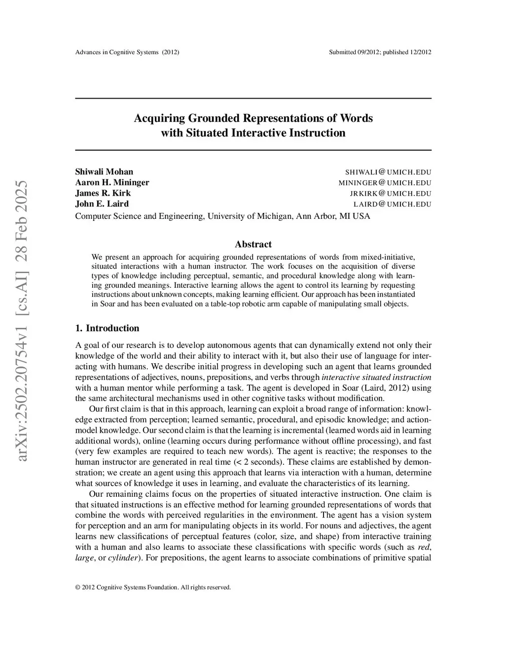 We present an approach for acquiring grounded representations of words from mixed-initiative, situated interactions with a human instructor. The work focuses on the acquisition of diverse types of knowledge including perceptual, semantic, and procedural knowledge along with learning grounded meanings. Interactive learning allows the agent to control its learning by requesting instructions about unknown concepts, making learning efficient. Our approach has been instantiated in Soar and has been evaluated on a table-top robotic arm capable of manipulating small objects.