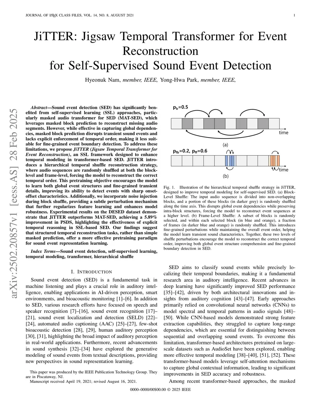 Sound event detection (SED) has significantly benefited from self-supervised learning (SSL) approaches, particularly masked audio transformer for SED (MAT-SED), which leverages masked block prediction to reconstruct missing audio segments. However, while effective in capturing global dependencies, masked block prediction disrupts transient sound events and lacks explicit enforcement of temporal order, making it less suitable for fine-grained event boundary detection. To address these limitations, we propose JiTTER (Jigsaw Temporal Transformer for Event Reconstruction), an SSL framework designed to enhance temporal modeling in transformer-based SED. JiTTER introduces a hierarchical temporal shuffle reconstruction strategy, where audio sequences are randomly shuffled at both the block-level and frame-level, forcing the model to reconstruct the correct temporal order. This pretraining objective encourages the model to learn both global event structures and fine-grained transient details, improving its ability to detect events with sharp onset-offset characteristics. Additionally, we incorporate noise injection during block shuffle, providing a subtle perturbation mechanism that further regularizes feature learning and enhances model robustness. Experimental results on the DESED dataset demonstrate that JiTTER outperforms MAT-SED, achieving a 5.89% improvement in PSDS, highlighting the effectiveness of explicit temporal reasoning in SSL-based SED. Our findings suggest that structured temporal reconstruction tasks, rather than simple masked prediction, offer a more effective pretraining paradigm for sound event representation learning.