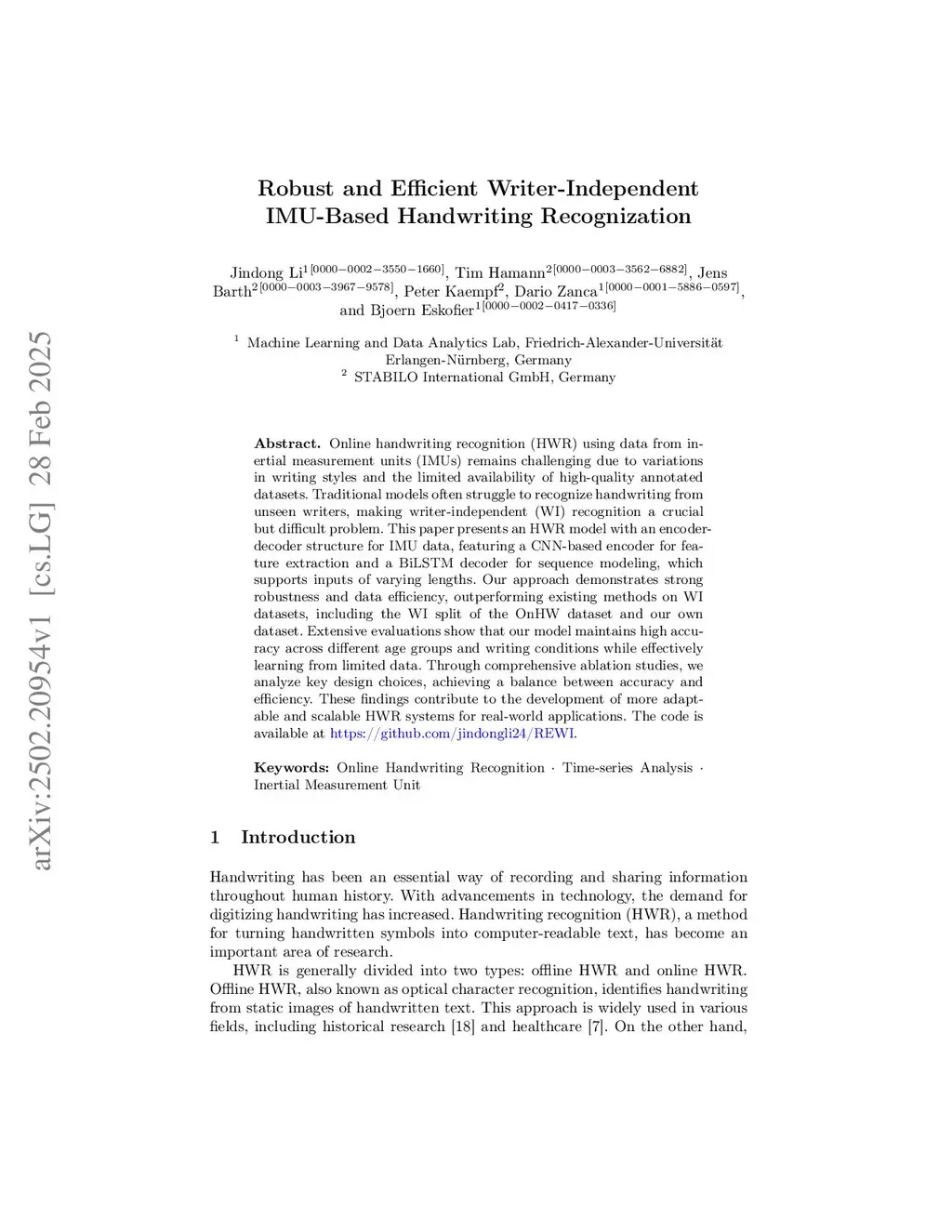 Robust and Efficient Writer-Independent IMU-Based Handwriting Recognition