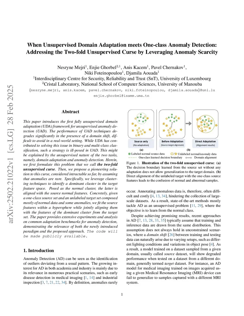 This paper introduces the first fully unsupervised domain adaptation (UDA) framework for unsupervised anomaly detection (UAD). The performance of UAD techniques degrades significantly in the presence of a domain shift, difficult to avoid in a real-world setting. While UDA has contributed to solving this issue in binary and multi-class classification, such a strategy is ill-posed in UAD. This might be explained by the unsupervised nature of the two tasks, namely, domain adaptation and anomaly detection. Herein, we first formulate this problem that we call the two-fold unsupervised curse. Then, we propose a pioneering solution to this curse, considered intractable so far, by assuming that anomalies are rare. Specifically, we leverage clustering techniques to identify a dominant cluster in the target feature space. Posed as the normal cluster, the latter is aligned with the source normal features. Concretely, given a one-class source set and an unlabeled target set composed mostly of normal data and some anomalies, we fit the source features within a hypersphere while jointly aligning them with the features of the dominant cluster from the target set. The paper provides extensive experiments and analysis on common adaptation benchmarks for anomaly detection, demonstrating the relevance of both the newly introduced paradigm and the proposed approach. The code will be made publicly available.