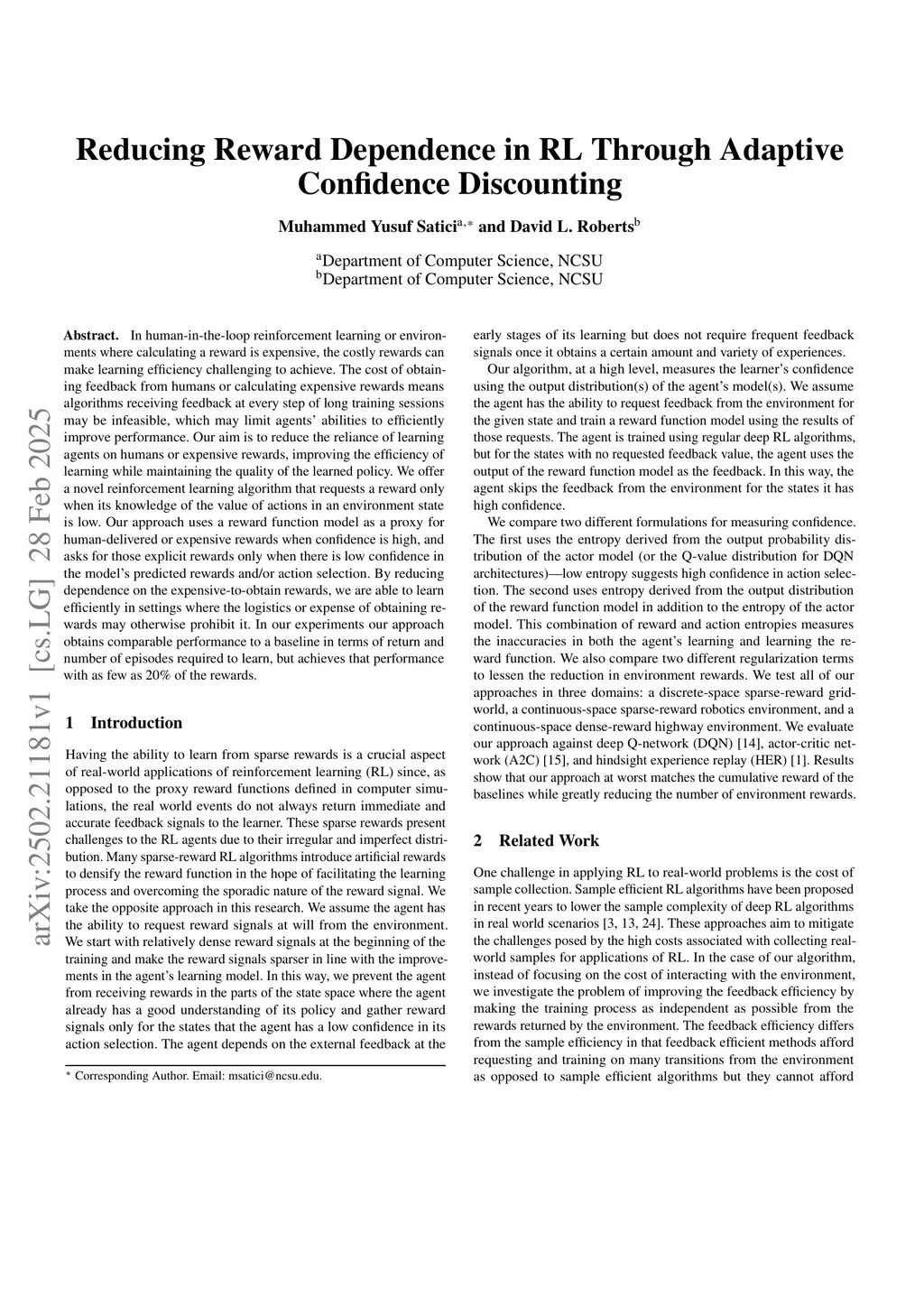 In human-in-the-loop reinforcement learning or environments where calculating a reward is expensive, the costly rewards can make learning efficiency challenging to achieve. The cost of obtaining feedback from humans or calculating expensive rewards means algorithms receiving feedback at every step of long training sessions may be infeasible, which may limit agents' abilities to efficiently improve performance. Our aim is to reduce the reliance of learning agents on humans or expensive rewards, improving the efficiency of learning while maintaining the quality of the learned policy. We offer a novel reinforcement learning algorithm that requests a reward only when its knowledge of the value of actions in an environment state is low. Our approach uses a reward function model as a proxy for human-delivered or expensive rewards when confidence is high, and asks for those explicit rewards only when there is low confidence in the model's predicted rewards and/or action selection. By reducing dependence on the expensive-to-obtain rewards, we are able to learn efficiently in settings where the logistics or expense of obtaining rewards may otherwise prohibit it. In our experiments our approach obtains comparable performance to a baseline in terms of return and number of episodes required to learn, but achieves that performance with as few as 20% of the rewards.
