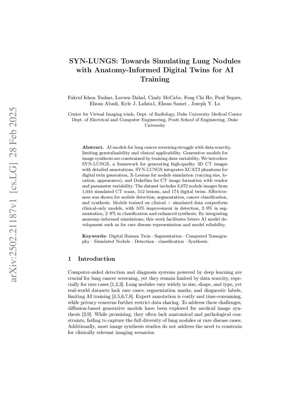 AI models for lung cancer screening are limited by data scarcity, impacting generalizability and clinical applicability. Generative models address this issue but are constrained by training data variability. We introduce SYN-LUNGS, a framework for generating high-quality 3D CT images with detailed annotations. SYN-LUNGS integrates XCAT3 phantoms for digital twin generation, X-Lesions for nodule simulation (varying size, location, and appearance), and DukeSim for CT image formation with vendor and parameter variability. The dataset includes 3,072 nodule images from 1,044 simulated CT scans, with 512 lesions and 174 digital twins. Models trained on clinical + simulated data outperform clinical only models, achieving 10% improvement in detection, 2-9% in segmentation and classification, and enhanced synthesis. By incorporating anatomy-informed simulations, SYN-LUNGS provides a scalable approach for AI model development, particularly in rare disease representation and improving model reliability.
