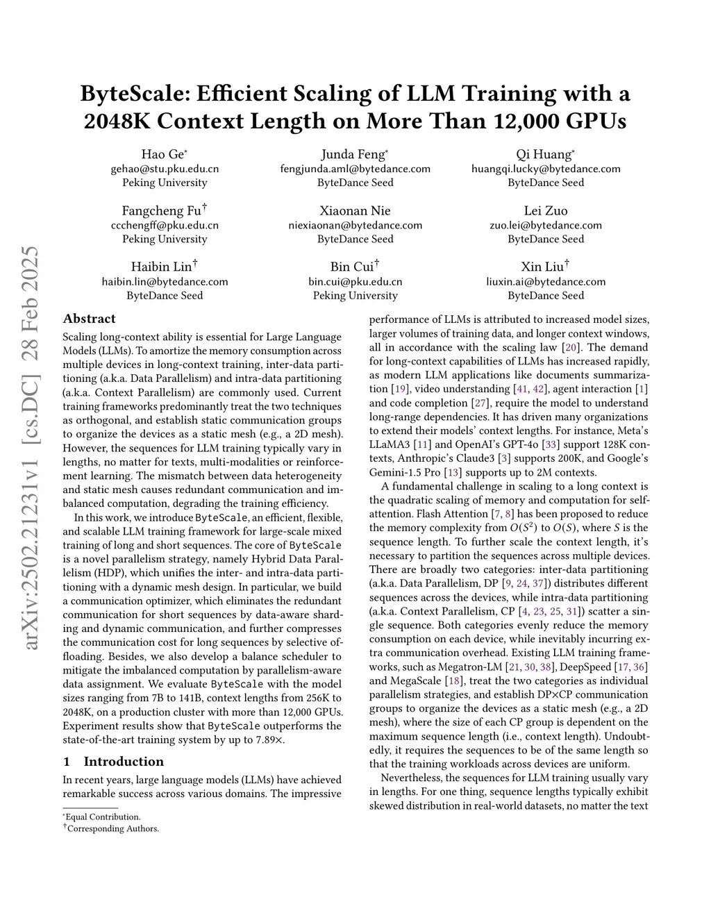 Scaling long-context ability is essential for Large Language Models (LLMs). To amortize the memory consumption across multiple devices in long-context training, inter-data partitioning (a.k.a. Data Parallelism) and intra-data partitioning (a.k.a. Context Parallelism) are commonly used. Current training frameworks predominantly treat the two techniques as orthogonal, and establish static communication groups to organize the devices as a static mesh (e.g., a 2D mesh). However, the sequences for LLM training typically vary in lengths, no matter for texts, multi-modalities or reinforcement learning. The mismatch between data heterogeneity and static mesh causes redundant communication and imbalanced computation, degrading the training efficiency.In this work, we introduce ByteScale, an efficient, flexible, and scalable LLM training framework for large-scale mixed training of long and short sequences. The core of ByteScale is a novel parallelism strategy, namely Hybrid Data Parallelism (HDP), which unifies the inter- and intra-data partitioning with a dynamic mesh design. In particular, we build a communication optimizer, which eliminates the redundant communication for short sequences by data-aware sharding and dynamic communication, and further compresses the communication cost for long sequences by selective offloading. Besides, we also develop a balance scheduler to mitigate the imbalanced computation by parallelism-aware data assignment. We evaluate ByteScale with the model sizes ranging from 7B to 141B, context lengths from 256K to 2048K, on a production cluster with more than 12,000 GPUs. Experiment results show that ByteScale outperforms the state-of-the-art training system by up to 7.89x.