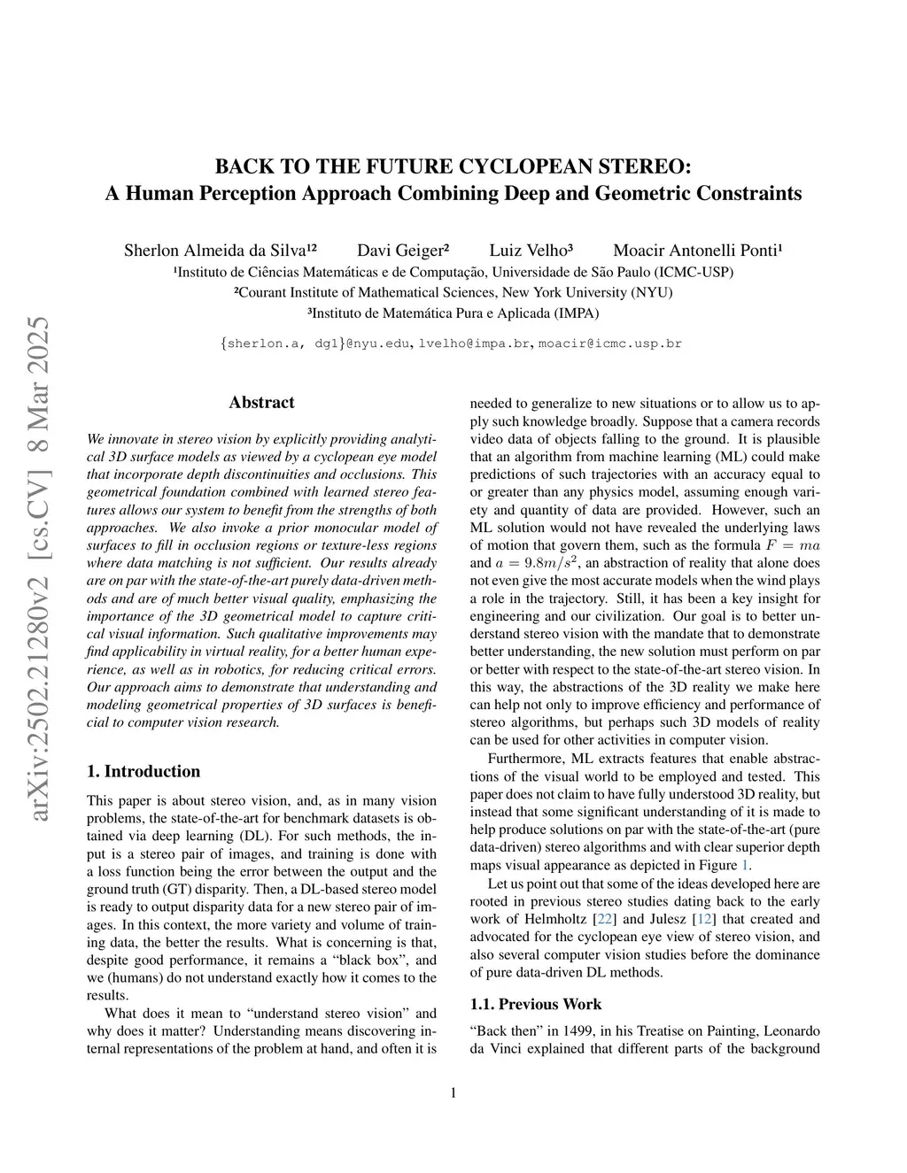 We innovate in stereo vision by explicitly providing analytical 3D surface models as viewed by a cyclopean eye model that incorporate depth discontinuities and occlusions. This geometrical foundation combined with learned stereo features allows our system to benefit from the strengths of both approaches. We also invoke a prior monocular model of surfaces to fill in occlusion regions or texture-less regions where data matching is not sufficient. Our results already are on par with the state-of-the-art purely data-driven methods and are of much better visual quality, emphasizing the importance of the 3D geometrical model to capture critical visual information. Such qualitative improvements may find applicability in virtual reality, for a better human experience, as well as in robotics, for reducing critical errors. Our approach aims to demonstrate that understanding and modeling geometrical properties of 3D surfaces is beneficial to computer vision research.