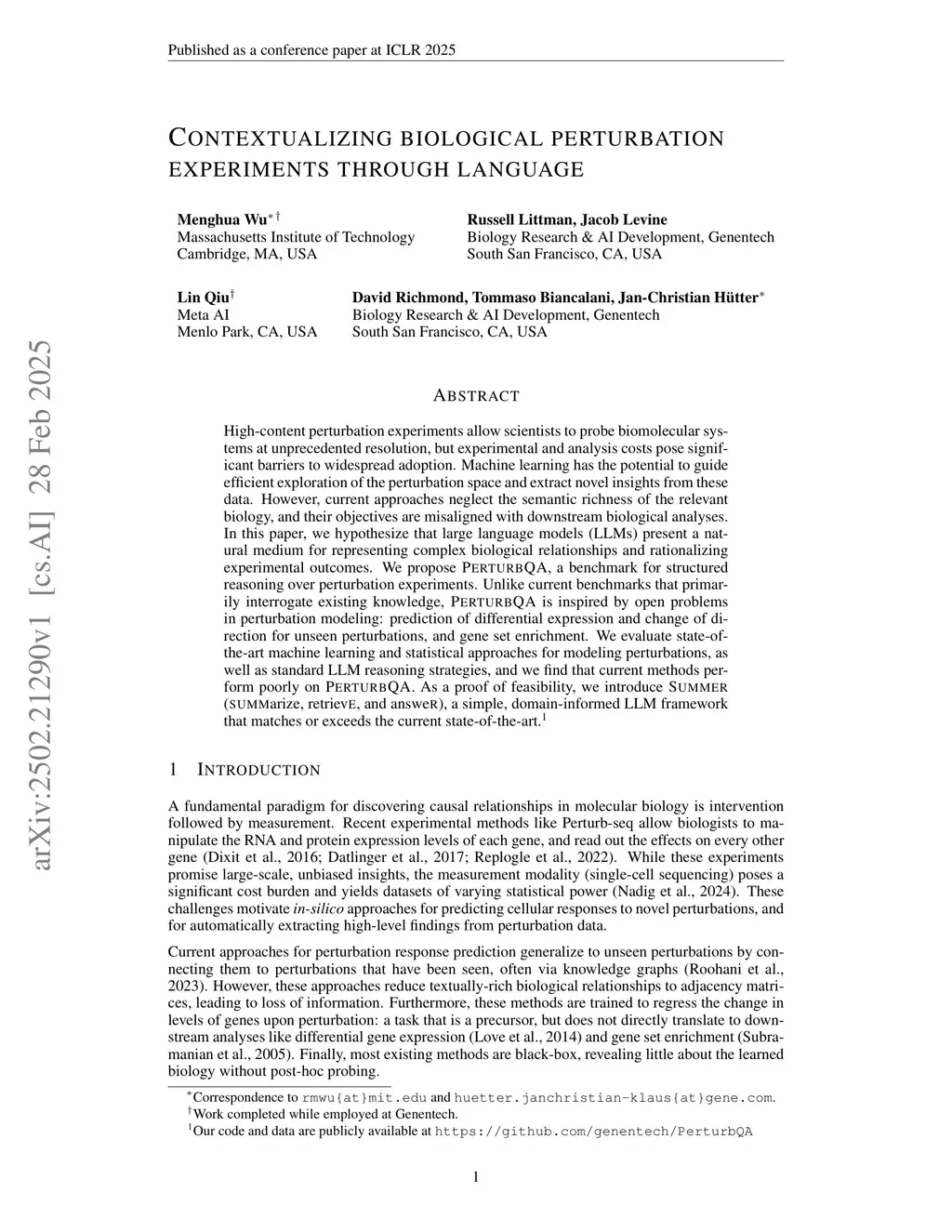 High-content perturbation experiments allow scientists to probe biomolecular systems at unprecedented resolution, but experimental and analysis costs pose significant barriers to widespread adoption. Machine learning has the potential to guide efficient exploration of the perturbation space and extract novel insights from these data. However, current approaches neglect the semantic richness of the relevant biology, and their objectives are misaligned with downstream biological analyses. In this paper, we hypothesize that large language models (LLMs) present a natural medium for representing complex biological relationships and rationalizing experimental outcomes. We propose PerturbQA, a benchmark for structured reasoning over perturbation experiments. Unlike current benchmarks that primarily interrogate existing knowledge, PerturbQA is inspired by open problems in perturbation modeling: prediction of differential expression and change of direction for unseen perturbations, and gene set enrichment. We evaluate state-of-the-art machine learning and statistical approaches for modeling perturbations, as well as standard LLM reasoning strategies, and we find that current methods perform poorly on PerturbQA. As a proof of feasibility, we introduce Summer (SUMMarize, retrievE, and answeR, a simple, domain-informed LLM framework that matches or exceeds the current state-of-the-art. Our code and data are publicly available atthis https URL.
