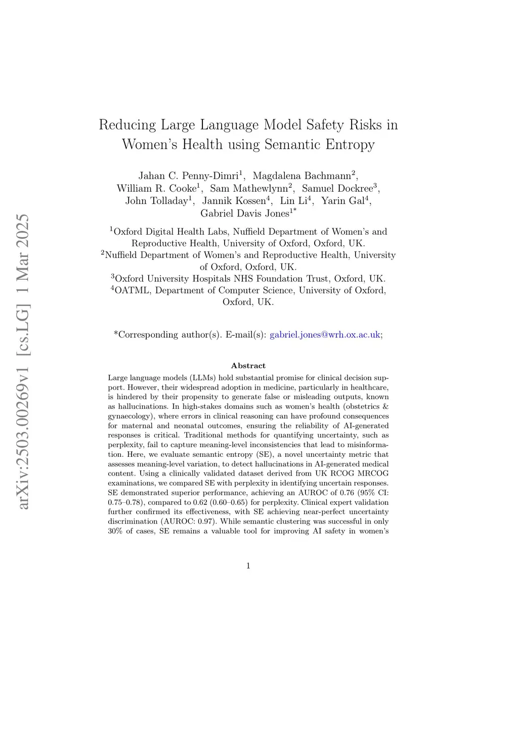 Large language models (LLMs) hold substantial promise for clinical decision support. However, their widespread adoption in medicine, particularly in healthcare, is hindered by their propensity to generate false or misleading outputs, known as hallucinations. In high-stakes domains such as women's health (obstetrics & gynaecology), where errors in clinical reasoning can have profound consequences for maternal and neonatal outcomes, ensuring the reliability of AI-generated responses is critical. Traditional methods for quantifying uncertainty, such as perplexity, fail to capture meaning-level inconsistencies that lead to misinformation. Here, we evaluate semantic entropy (SE), a novel uncertainty metric that assesses meaning-level variation, to detect hallucinations in AI-generated medical content. Using a clinically validated dataset derived from UK RCOG MRCOG examinations, we compared SE with perplexity in identifying uncertain responses. SE demonstrated superior performance, achieving an AUROC of 0.76 (95% CI: 0.75-0.78), compared to 0.62 (0.60-0.65) for perplexity. Clinical expert validation further confirmed its effectiveness, with SE achieving near-perfect uncertainty discrimination (AUROC: 0.97). While semantic clustering was successful in only 30% of cases, SE remains a valuable tool for improving AI safety in women's health. These findings suggest that SE could enable more reliable AI integration into clinical practice, particularly in resource-limited settings where LLMs could augment care. This study highlights the potential of SE as a key safeguard in the responsible deployment of AI-driven tools in women's health, leading to safer and more effective digital health interventions.