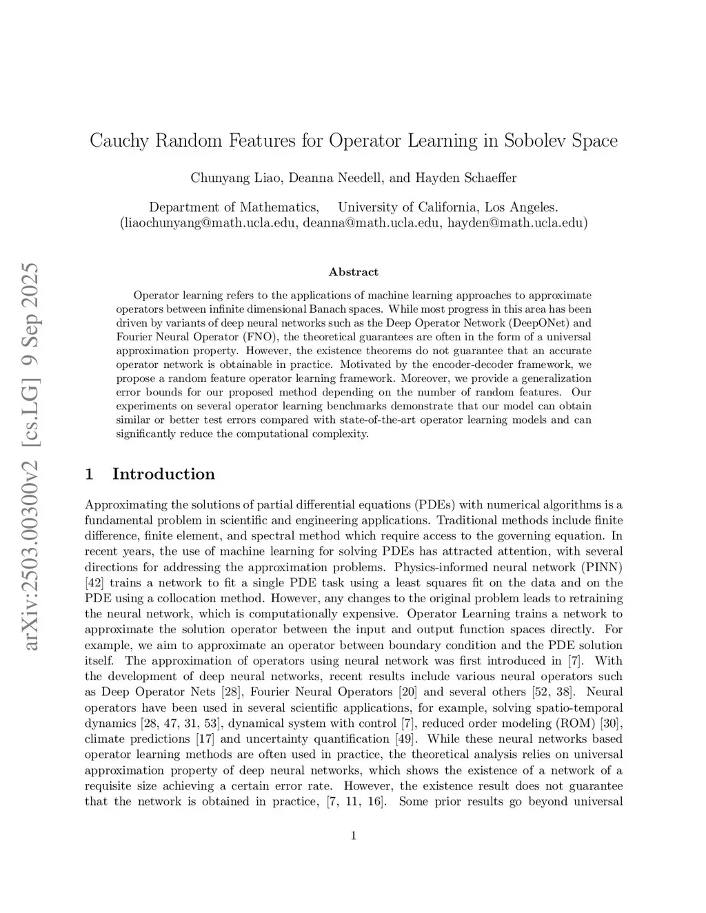 Cauchy Random Features for Operator Learning in Sobolev Space