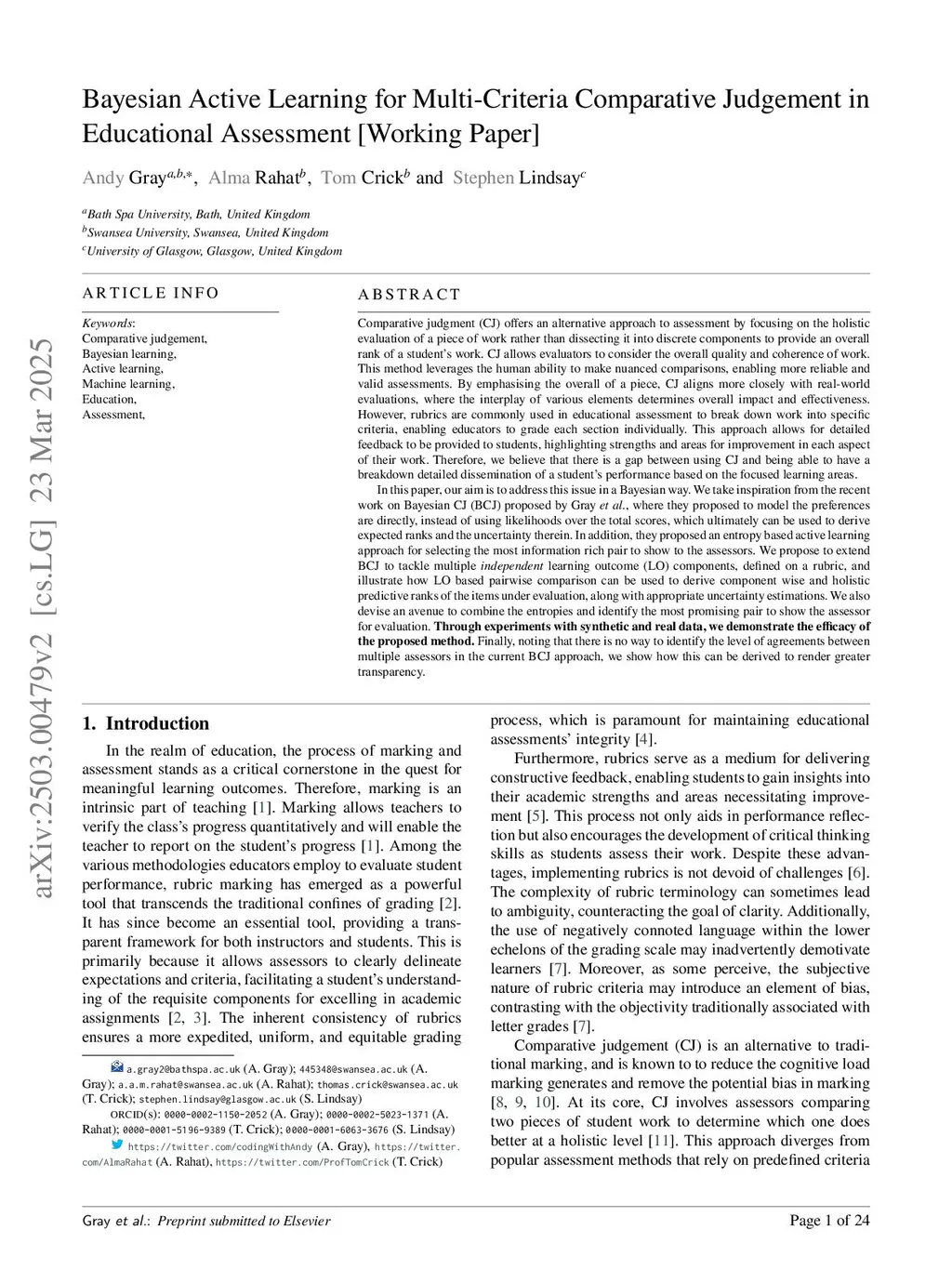 Bayesian Active Learning for Multi-Criteria Comparative Judgement in Educational Assessment