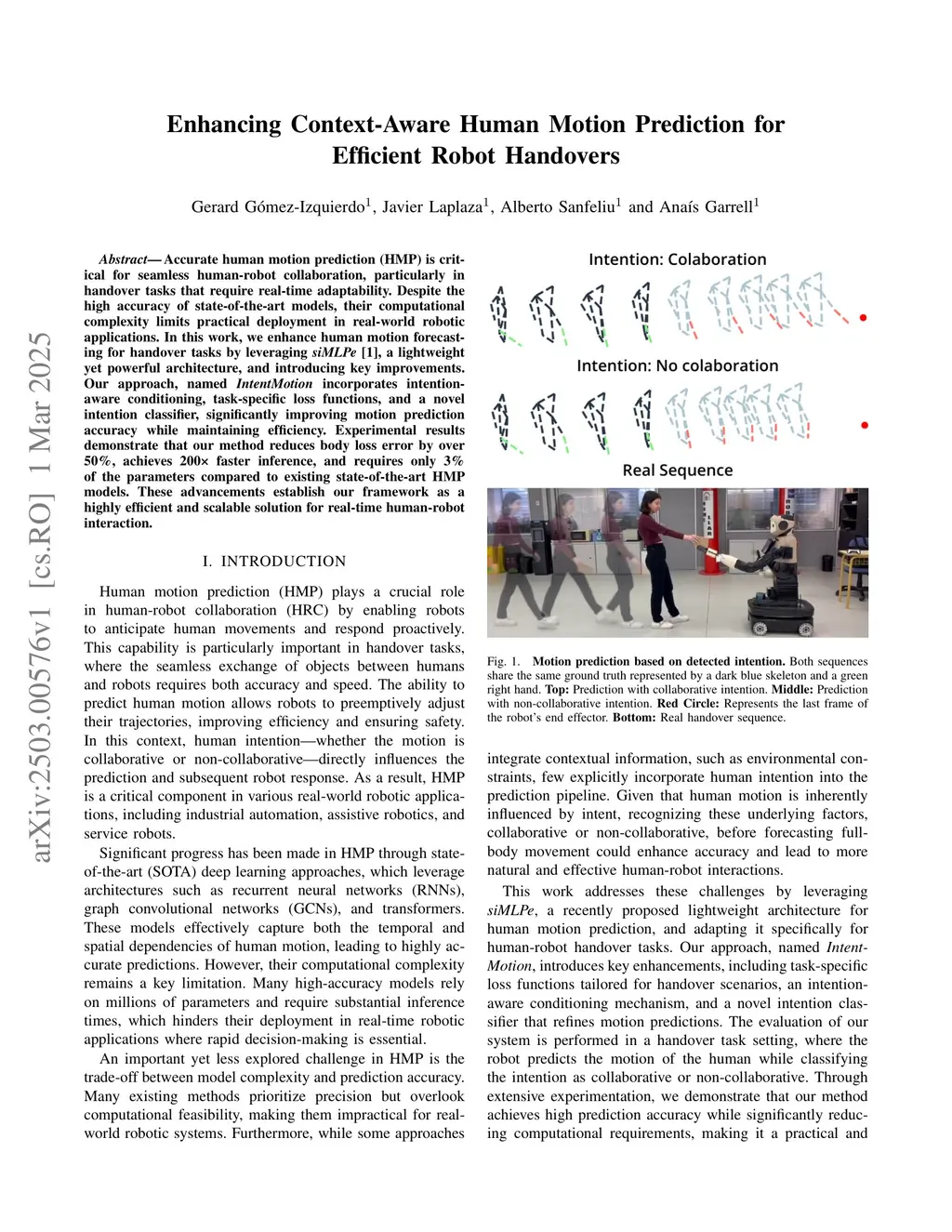 Accurate human motion prediction (HMP) is critical for seamless human-robot collaboration, particularly in handover tasks that require real-time adaptability. Despite the high accuracy of state-of-the-art models, their computational complexity limits practical deployment in real-world robotic applications. In this work, we enhance human motion forecasting for handover tasks by leveraging siMLPe [1], a lightweight yet powerful architecture, and introducing key improvements. Our approach, named IntentMotion incorporates intention-aware conditioning, task-specific loss functions, and a novel intention classifier, significantly improving motion prediction accuracy while maintaining efficiency. Experimental results demonstrate that our method reduces body loss error by over 50%, achieves 200x faster inference, and requires only 3% of the parameters compared to existing state-of-the-art HMP models. These advancements establish our framework as a highly efficient and scalable solution for real-time human-robot interaction.