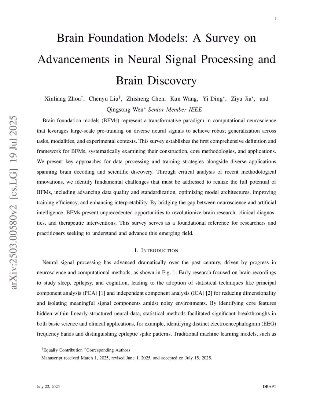 Brain foundation models (BFMs) have emerged as a transformative paradigm in computational neuroscience, offering a revolutionary framework for processing diverse neural signals across different brain-related tasks. These models leverage large-scale pre-training techniques, allowing them to generalize effectively across multiple scenarios, tasks, and modalities, thus overcoming the traditional limitations faced by conventional artificial intelligence (AI) approaches in understanding complex brain data. By tapping into the power of pretrained models, BFMs provide a means to process neural data in a more unified manner, enabling advanced analysis and discovery in the field of neuroscience. In this survey, we define BFMs for the first time, providing a clear and concise framework for constructing and utilizing these models in various applications. We also examine the key principles and methodologies for developing these models, shedding light on how they transform the landscape of neural signal processing. This survey presents a comprehensive review of the latest advancements in BFMs, covering the most recent methodological innovations, novel views of application areas, and challenges in the field. Notably, we highlight the future directions and key challenges that need to be addressed to fully realize the potential of BFMs. These challenges include improving the quality of brain data, optimizing model architecture for better generalization, increasing training efficiency, and enhancing the interpretability and robustness of BFMs in real-world applications.