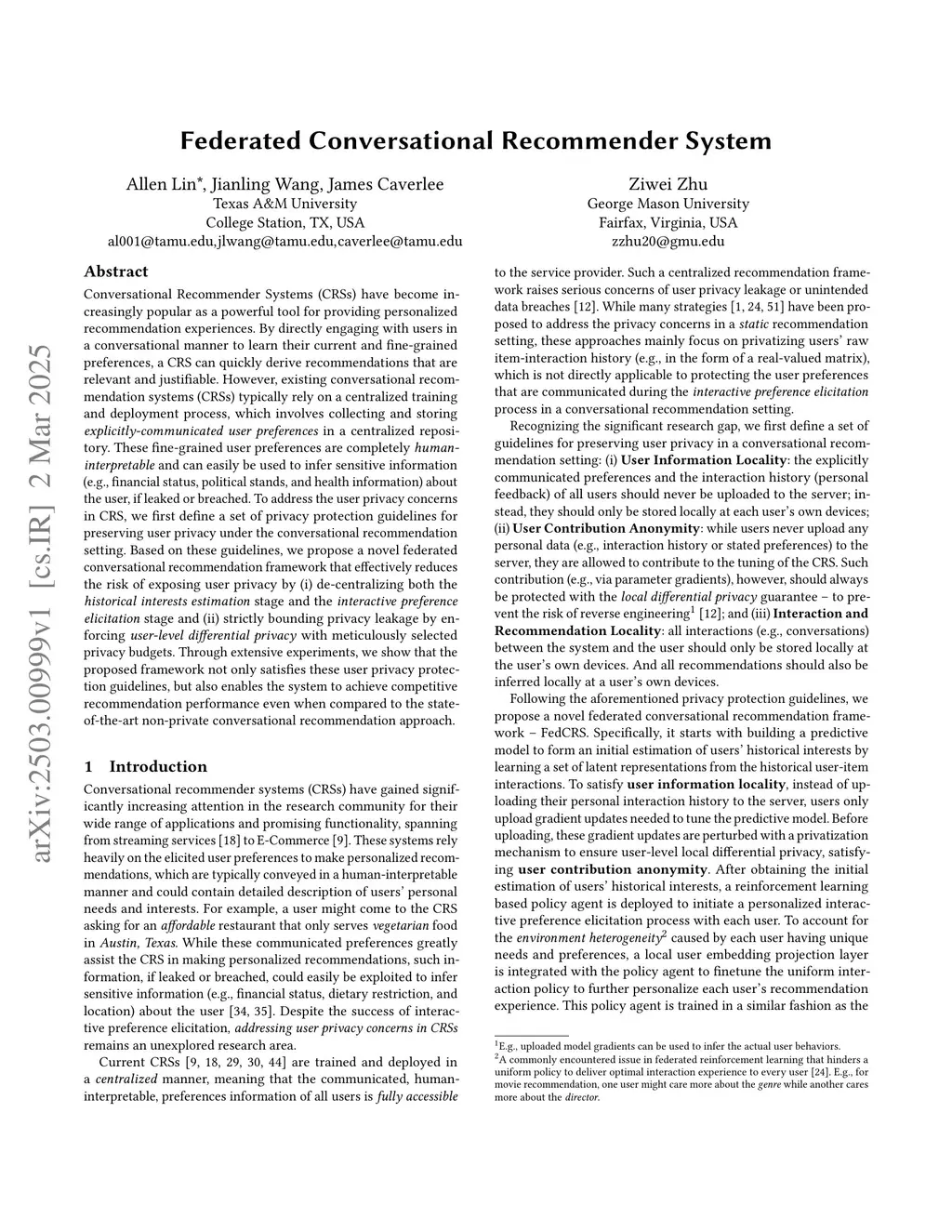 Conversational Recommender Systems (CRSs) have become increasingly popular as a powerful tool for providing personalized recommendation experiences. By directly engaging with users in a conversational manner to learn their current and fine-grained preferences, a CRS can quickly derive recommendations that are relevant and justifiable. However, existing conversational recommendation systems (CRSs) typically rely on a centralized training and deployment process, which involves collecting and storing explicitly-communicated user preferences in a centralized repository. These fine-grained user preferences are completely human-interpretable and can easily be used to infer sensitive information (e.g., financial status, political stands, and health information) about the user, if leaked or breached. To address the user privacy concerns in CRS, we first define a set of privacy protection guidelines for preserving user privacy under the conversational recommendation setting. Based on these guidelines, we propose a novel federated conversational recommendation framework that effectively reduces the risk of exposing user privacy by (i) de-centralizing both the historical interests estimation stage and the interactive preference elicitation stage and (ii) strictly bounding privacy leakage by enforcing user-level differential privacy with meticulously selected privacy budgets. Through extensive experiments, we show that the proposed framework not only satisfies these user privacy protection guidelines, but also enables the system to achieve competitive recommendation performance even when compared to the state-of-the-art non-private conversational recommendation approach.