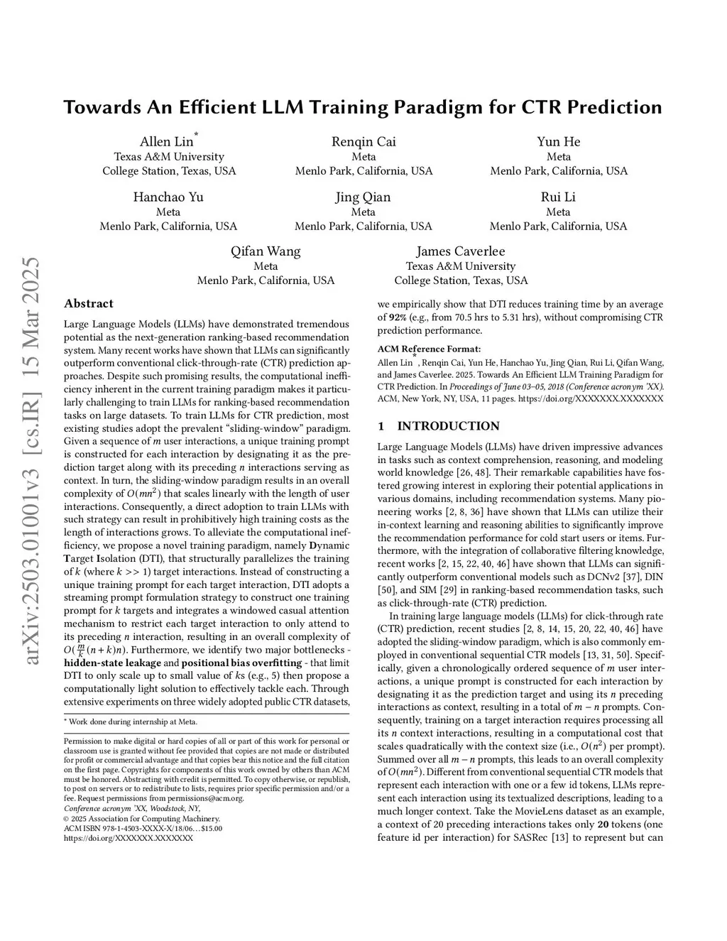 Large Language Models (LLMs) have demonstrated tremendous potential as the next-generation ranking-based recommendation system. Many recent works have shown that LLMs can significantly outperform conventional click-through-rate (CTR) prediction approaches. Despite such promising results, the computational inefficiency inherent in the current training paradigm makes it particularly challenging to train LLMs for ranking-based recommendation tasks on large datasets. To train LLMs for CTR prediction, most existing studies adopt the prevalent ''sliding-window'' paradigm. Given a sequence of user interactions, a unique training prompt is constructed for each interaction by designating it as the prediction target along with its preceding interactions serving as context. In turn, the sliding-window paradigm results in an overall complexity of that scales linearly with the length of user interactions. Consequently, a direct adoption to train LLMs with such strategy can result in prohibitively high training costs as the length of interactions grows. To alleviate the computational inefficiency, we propose a novel training paradigm, namely Dynamic Target Isolation (DTI), that structurally parallelizes the training of (where ) target interactions. Furthermore, we identify two major bottlenecks - hidden-state leakage and positional bias overfitting - that limit DTI to only scale up to a small value of (e.g., 5) then propose a computationally light solution to effectively tackle each. Through extensive experiments on three widely adopted public CTR datasets, we empirically show that DTI reduces training time by an average of \textbf{92%} (e.g., from hrs to hrs), without compromising CTR prediction performance.