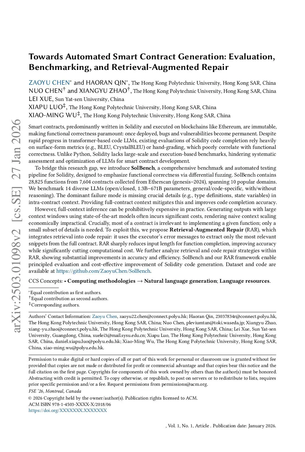 Towards Automated Smart Contract Generation: Evaluation, Benchmarking, and Retrieval-Augmented Repair