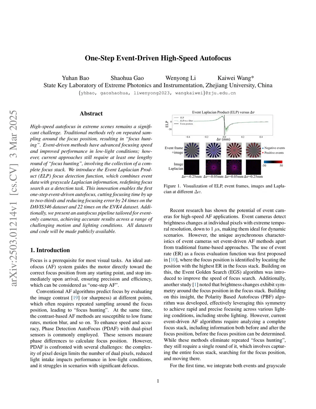 High-speed autofocus in extreme scenes remains a significant challenge. Traditional methods rely on repeated sampling around the focus position, resulting in ``focus hunting''. Event-driven methods have advanced focusing speed and improved performance in low-light conditions; however, current approaches still require at least one lengthy round of ``focus hunting'', involving the collection of a complete focus stack. We introduce the Event Laplacian Product (ELP) focus detection function, which combines event data with grayscale Laplacian information, redefining focus search as a detection task. This innovation enables the first one-step event-driven autofocus, cutting focusing time by up to two-thirds and reducing focusing error by 24 times on the DAVIS346 dataset and 22 times on the EVK4 dataset. Additionally, we present an autofocus pipeline tailored for event-only cameras, achieving accurate results across a range of challenging motion and lighting conditions. All datasets and code will be made publicly available.