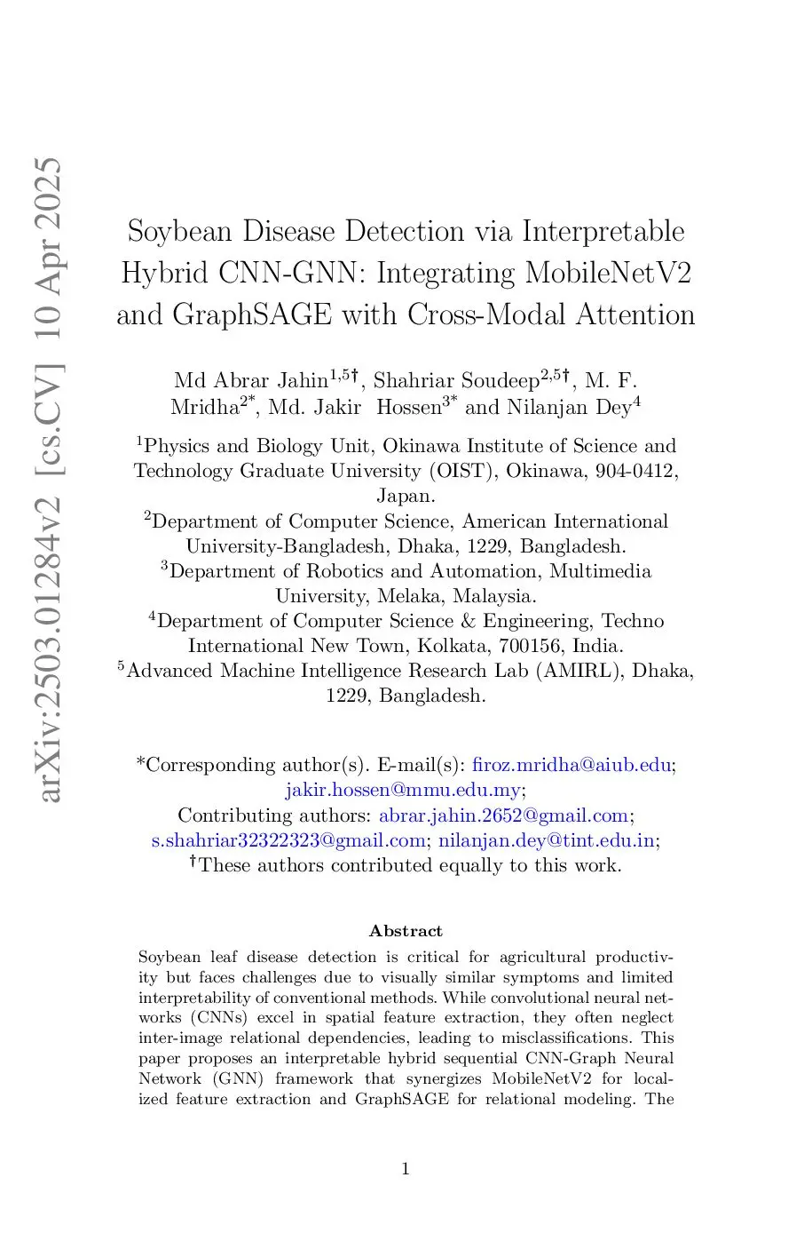 Soybean Disease Detection via Interpretable Hybrid CNN-GNN: Integrating MobileNetV2 and GraphSAGE with Cross-Modal Attention