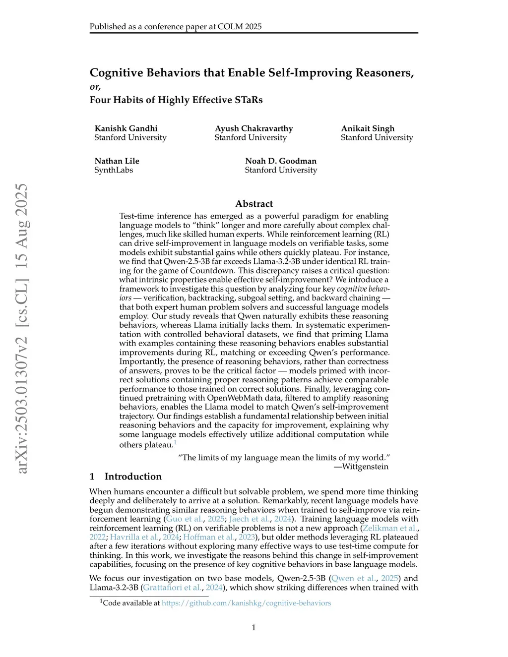 Cognitive Behaviors that Enable Self-Improving Reasoners, or, Four Habits of Highly Effective STaRs