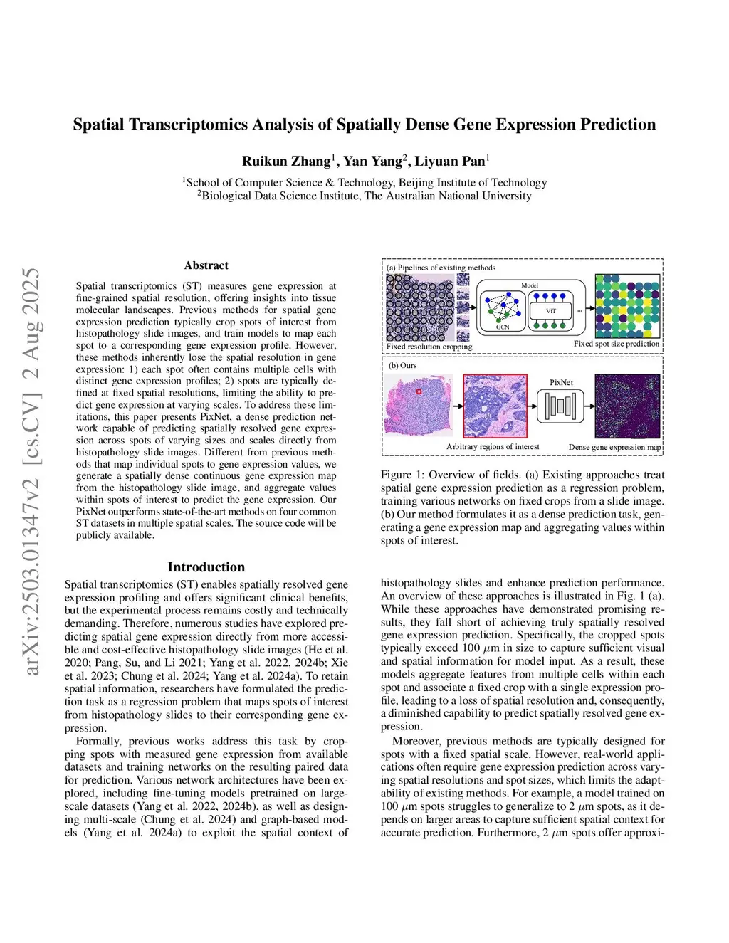 Spatial transcriptomics (ST) measures gene expression at fine-grained spatial resolution, offering insights into tissue molecular landscapes. Previous methods for spatial gene expression prediction typically crop spots of interest from histopathology slide images, and train models to map each spot to a corresponding gene expression profile. However, these methods inherently lose the spatial resolution in gene expression: 1) each spot often contains multiple cells with distinct gene expression profiles; 2) spots are typically defined at fixed spatial resolutions, limiting the ability to predict gene expression at varying scales. To address these limitations, this paper presents PixNet, a dense prediction network capable of predicting spatially resolved gene expression across spots of varying sizes and scales directly from histopathology slide images. Different from previous methods that map individual spots to gene expression values, we generate a spatially dense continuous gene expression map from the histopathology slide image, and aggregate values within spots of interest to predict the gene expression. Our PixNet outperforms state-of-the-art methods on four common ST datasets in multiple spatial scales. The source code will be publicly available.