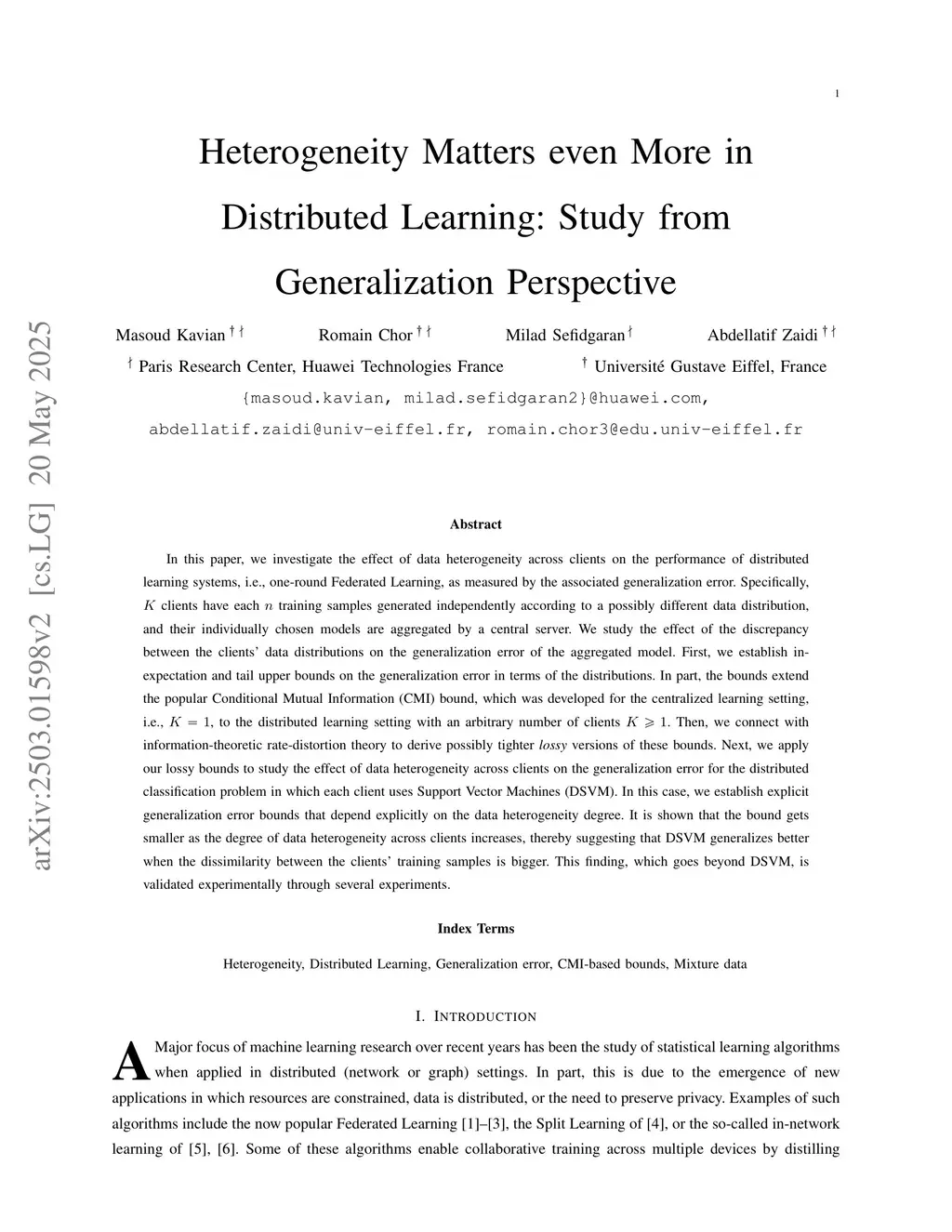 In this paper, we investigate the effect of data heterogeneity across clients on the performance of distributed learning systems, i.e., one-round Federated Learning, as measured by the associated generalization error. Specifically, clients have each training samples generated independently according to a possibly different data distribution, and their individually chosen models are aggregated by a central server. We study the effect of the discrepancy between the clients' data distributions on the generalization error of the aggregated model. First, we establish in-expectation and tail upper bounds on the generalization error in terms of the distributions. In part, the bounds extend the popular Conditional Mutual Information (CMI) bound, which was developed for the centralized learning setting, i.e., , to the distributed learning setting with an arbitrary number of clients . Then, we connect with information-theoretic rate-distortion theory to derive possibly tighter \textit{lossy} versions of these bounds. Next, we apply our lossy bounds to study the effect of data heterogeneity across clients on the generalization error for the distributed classification problem in which each client uses Support Vector Machines (DSVM). In this case, we establish explicit generalization error bounds that depend explicitly on the data heterogeneity degree. It is shown that the bound gets smaller as the degree of data heterogeneity across clients increases, thereby suggesting that DSVM generalizes better when the dissimilarity between the clients' training samples is bigger. This finding, which goes beyond DSVM, is validated experimentally through several experiments.