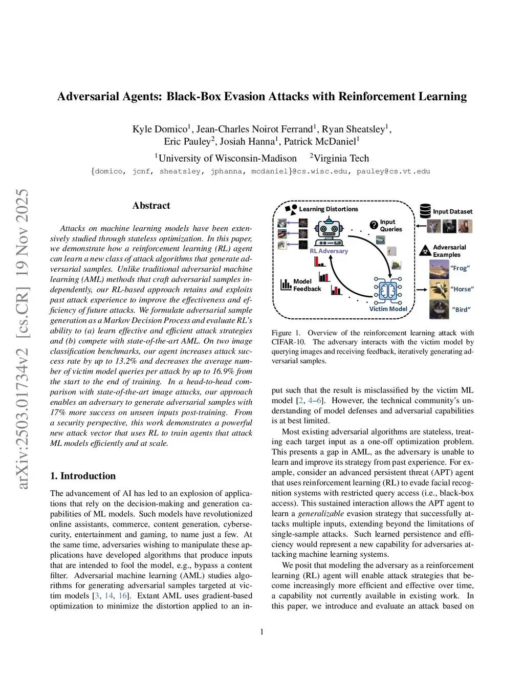 Reinforcement learning (RL) offers powerful techniques for solving complex sequential decision-making tasks from experience. In this paper, we demonstrate how RL can be applied to adversarial machine learning (AML) to develop a new class of attacks that learn to generate adversarial examples: inputs designed to fool machine learning models. Unlike traditional AML methods that craft adversarial examples independently, our RL-based approach retains and exploits past attack experience to improve future attacks. We formulate adversarial example generation as a Markov Decision Process and evaluate RL's ability to (a) learn effective and efficient attack strategies and (b) compete with state-of-the-art AML. On CIFAR-10, our agent increases the success rate of adversarial examples by 19.4% and decreases the median number of victim model queries per adversarial example by 53.2% from the start to the end of training. In a head-to-head comparison with a state-of-the-art image attack, SquareAttack, our approach enables an adversary to generate adversarial examples with 13.1% more success after 5000 episodes of training. From a security perspective, this work demonstrates a powerful new attack vector that uses RL to attack ML models efficiently and at scale.