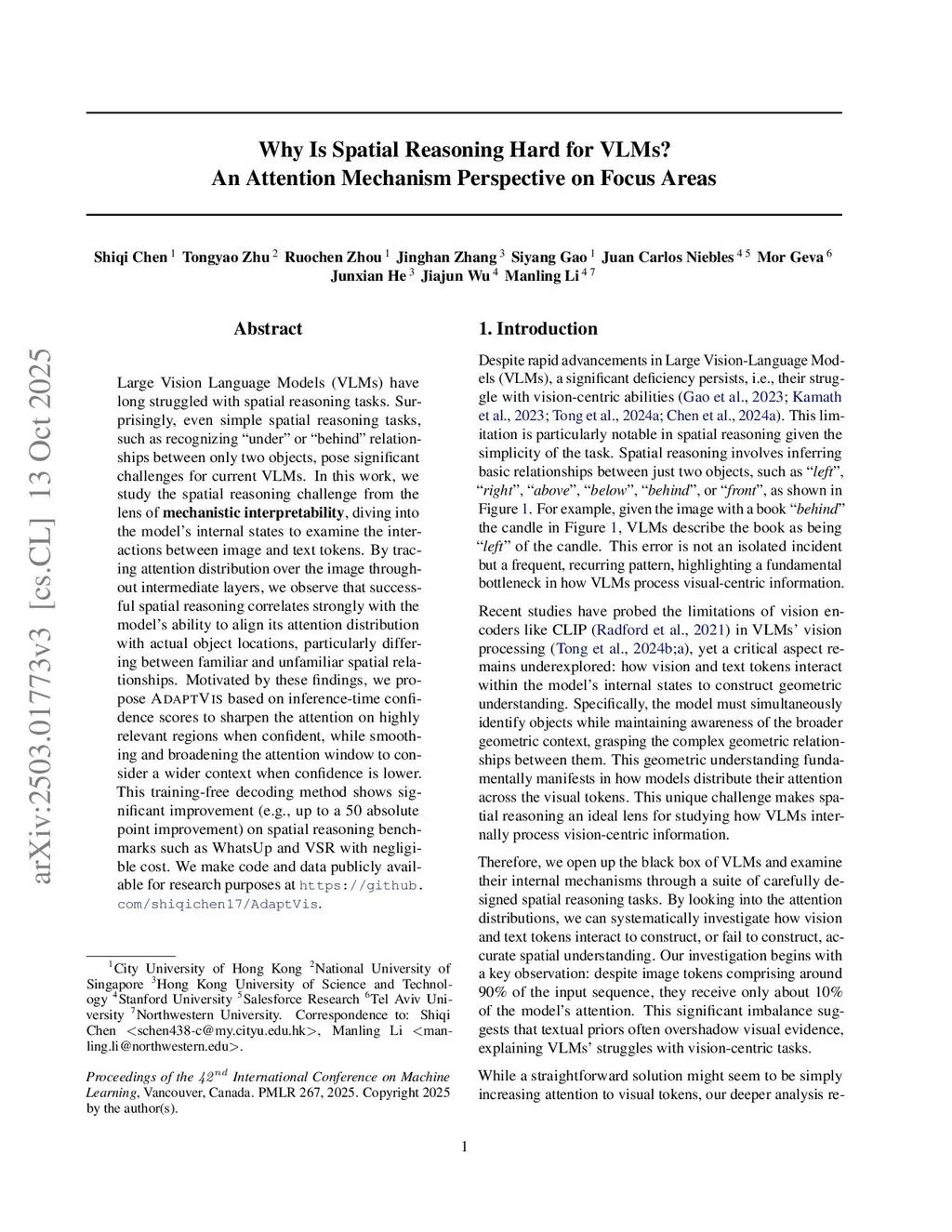 Large Vision Language Models (VLMs) have long struggled with spatial reasoning tasks. Surprisingly, even simple spatial reasoning tasks, such as recognizing "under" or "behind" relationships between only two objects, pose significant challenges for current VLMs. In this work, we study the spatial reasoning challenge from the lens of mechanistic interpretability, diving into the model's internal states to examine the interactions between image and text tokens. By tracing attention distribution over the image through out intermediate layers, we observe that successful spatial reasoning correlates strongly with the model's ability to align its attention distribution with actual object locations, particularly differing between familiar and unfamiliar spatial relationships. Motivated by these findings, we propose ADAPTVIS based on inference-time confidence scores to sharpen the attention on highly relevant regions when confident, while smoothing and broadening the attention window to consider a wider context when confidence is lower. This training-free decoding method shows significant improvement (e.g., up to a 50 absolute point improvement) on spatial reasoning benchmarks such as WhatsUp and VSR with negligible cost. We make code and data publicly available for research purposes atthis https URL.