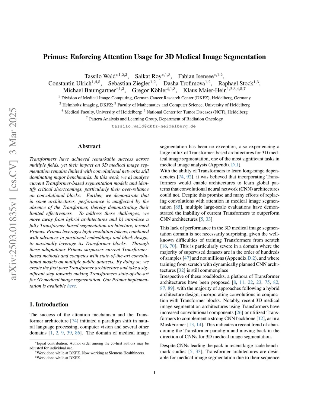 Transformers have achieved remarkable success across multiple fields, yet their impact on 3D medical image segmentation remains limited with convolutional networks still dominating major benchmarks. In this work, we a) analyze current Transformer-based segmentation models and identify critical shortcomings, particularly their over-reliance on convolutional blocks. Further, we demonstrate that in some architectures, performance is unaffected by the absence of the Transformer, thereby demonstrating their limited effectiveness. To address these challenges, we move away from hybrid architectures and b) introduce a fully Transformer-based segmentation architecture, termed Primus. Primus leverages high-resolution tokens, combined with advances in positional embeddings and block design, to maximally leverage its Transformer blocks. Through these adaptations Primus surpasses current Transformer-based methods and competes with state-of-the-art convolutional models on multiple public datasets. By doing so, we create the first pure Transformer architecture and take a significant step towards making Transformers state-of-the-art for 3D medical image segmentation.