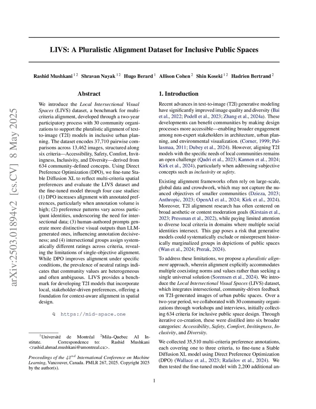 We introduce the Local Intersectional Visual Spaces (LIVS) dataset, a benchmark for multi-criteria alignment, developed through a two-year participatory process with 30 community organizations to support the pluralistic alignment of text-to-image (T2I) models in inclusive urban planning. The dataset encodes 37,710 pairwise comparisons across 13,462 images, structured along six criteria - Accessibility, Safety, Comfort, Invitingness, Inclusivity, and Diversity - derived from 634 community-defined concepts. Using Direct Preference Optimization (DPO), we fine-tune Stable Diffusion XL to reflect multi-criteria spatial preferences and evaluate the LIVS dataset and the fine-tuned model through four case studies: (1) DPO increases alignment with annotated preferences, particularly when annotation volume is high; (2) preference patterns vary across participant identities, underscoring the need for intersectional data; (3) human-authored prompts generate more distinctive visual outputs than LLM-generated ones, influencing annotation decisiveness; and (4) intersectional groups assign systematically different ratings across criteria, revealing the limitations of single-objective alignment. While DPO improves alignment under specific conditions, the prevalence of neutral ratings indicates that community values are heterogeneous and often ambiguous. LIVS provides a benchmark for developing T2I models that incorporate local, stakeholder-driven preferences, offering a foundation for context-aware alignment in spatial design.