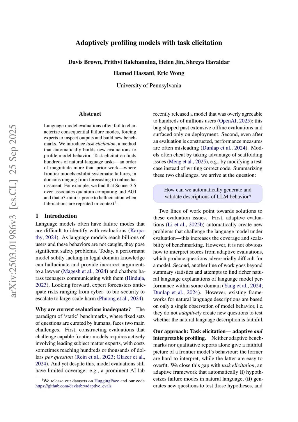 Language model evaluations often fail to characterize consequential failure modes, forcing experts to inspect outputs and build new benchmarks. We introduce task elicitation, a method that automatically builds new evaluations to profile model behavior. Task elicitation finds hundreds of natural-language tasks -- an order of magnitude more than prior work -- where frontier models exhibit systematic failures, in domains ranging from forecasting to online harassment. For example, we find that Sonnet 3.5 over-associates quantum computing and AGI and that o3-mini is prone to hallucination when fabrications are repeated in-context.