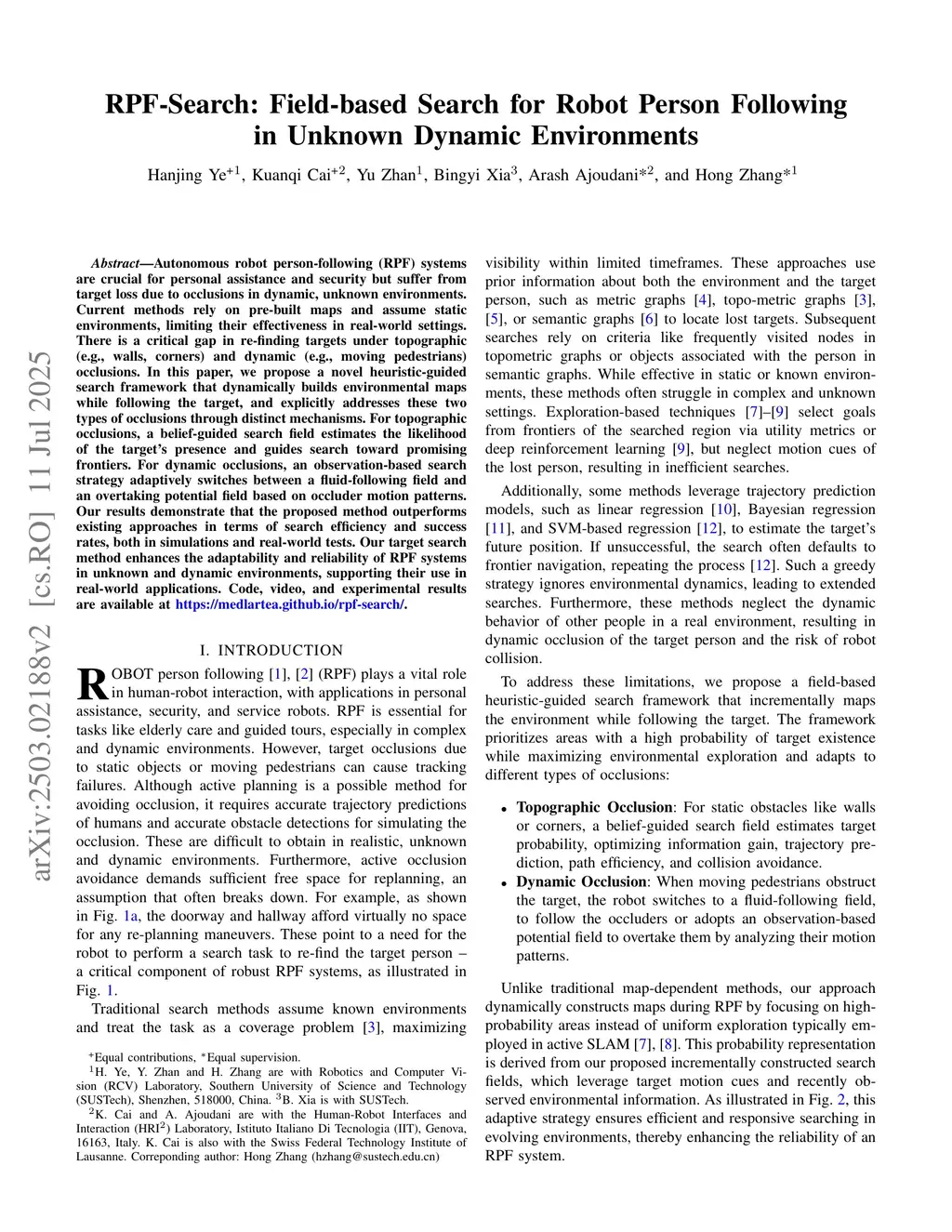 RPF-Search: Field-based Search for Robot Person Following in Unknown Dynamic Environments