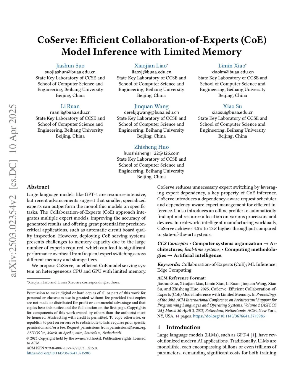 Large language models like GPT-4 are resource-intensive, but recent advancements suggest that smaller, specialized experts can outperform the monolithic models on specific tasks. The Collaboration-of-Experts (CoE) approach integrates multiple expert models, improving the accuracy of generated results and offering great potential for precision-critical applications, such as automatic circuit board quality inspection. However, deploying CoE serving systems presents challenges to memory capacity due to the large number of experts required, which can lead to significant performance overhead from frequent expert switching across different memory and storage tiers.We propose CoServe, an efficient CoE model serving system on heterogeneous CPU and GPU with limited memory. CoServe reduces unnecessary expert switching by leveraging expert dependency, a key property of CoE inference. CoServe introduces a dependency-aware request scheduler and dependency-aware expert management for efficient inference. It also introduces an offline profiler to automatically find optimal resource allocation on various processors and devices. In real-world intelligent manufacturing workloads, CoServe achieves 4.5 to 12 higher throughput compared to state-of-the-art systems.