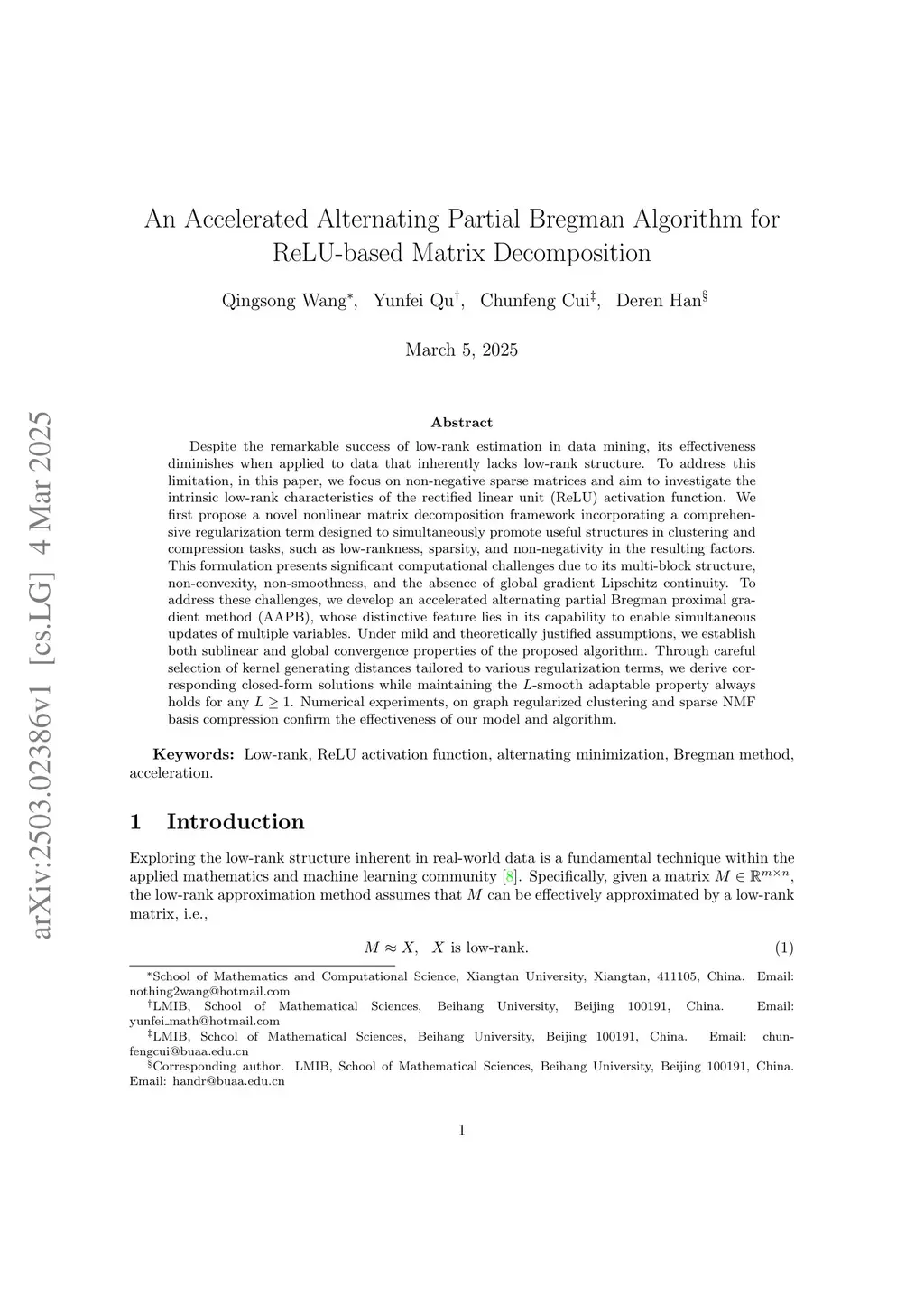 Despite the remarkable success of low-rank estimation in data mining, its effectiveness diminishes when applied to data that inherently lacks low-rank structure. To address this limitation, in this paper, we focus on non-negative sparse matrices and aim to investigate the intrinsic low-rank characteristics of the rectified linear unit (ReLU) activation function. We first propose a novel nonlinear matrix decomposition framework incorporating a comprehensive regularization term designed to simultaneously promote useful structures in clustering and compression tasks, such as low-rankness, sparsity, and non-negativity in the resulting factors. This formulation presents significant computational challenges due to its multi-block structure, non-convexity, non-smoothness, and the absence of global gradient Lipschitz continuity. To address these challenges, we develop an accelerated alternating partial Bregman proximal gradient method (AAPB), whose distinctive feature lies in its capability to enable simultaneous updates of multiple variables. Under mild and theoretically justified assumptions, we establish both sublinear and global convergence properties of the proposed algorithm. Through careful selection of kernel generating distances tailored to various regularization terms, we derive corresponding closed-form solutions while maintaining the -smooth adaptable property always holds for any . Numerical experiments, on graph regularized clustering and sparse NMF basis compression confirm the effectiveness of our model and algorithm.