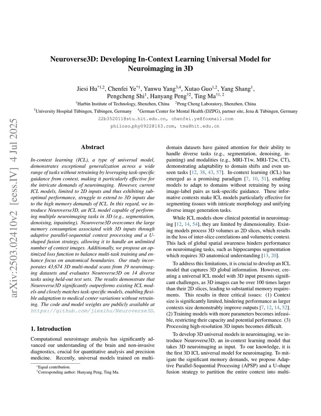 In-context learning (ICL), a type of universal model, demonstrates exceptional generalization across a wide range of tasks without retraining by leveraging task-specific guidance from context, making it particularly effective for the intricate demands of neuroimaging. However, current ICL models, limited to 2D inputs and thus exhibiting suboptimal performance, struggle to extend to 3D inputs due to the high memory demands of ICL. In this regard, we introduce Neuroverse3D, an ICL model capable of performing multiple neuroimaging tasks in 3D (e.g., segmentation, denoising, inpainting). Neuroverse3D overcomes the large memory consumption associated with 3D inputs through adaptive parallel-sequential context processing and a U-shaped fusion strategy, allowing it to handle an unlimited number of context images. Additionally, we propose an optimized loss function to balance multi-task training and enhance focus on anatomical boundaries. Our study incorporates 43,674 3D multi-modal scans from 19 neuroimaging datasets and evaluates Neuroverse3D on 14 diverse tasks using held-out test sets. The results demonstrate that Neuroverse3D significantly outperforms existing ICL models and closely matches task-specific models, enabling flexible adaptation to medical center variations without retraining. The code and model weights are publicly available atthis https URL.