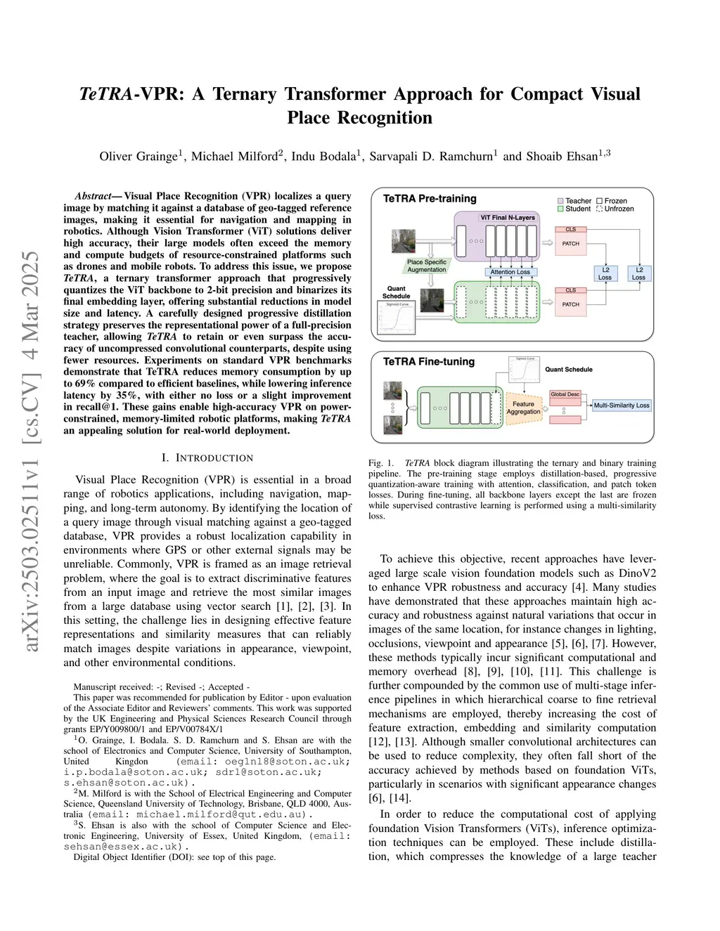 Visual Place Recognition (VPR) localizes a query image by matching it against a database of geo-tagged reference images, making it essential for navigation and mapping in robotics. Although Vision Transformer (ViT) solutions deliver high accuracy, their large models often exceed the memory and compute budgets of resource-constrained platforms such as drones and mobile robots. To address this issue, we propose TeTRA, a ternary transformer approach that progressively quantizes the ViT backbone to 2-bit precision and binarizes its final embedding layer, offering substantial reductions in model size and latency. A carefully designed progressive distillation strategy preserves the representational power of a full-precision teacher, allowing TeTRA to retain or even surpass the accuracy of uncompressed convolutional counterparts, despite using fewer resources. Experiments on standard VPR benchmarks demonstrate that TeTRA reduces memory consumption by up to 69% compared to efficient baselines, while lowering inference latency by 35%, with either no loss or a slight improvement in recall@1. These gains enable high-accuracy VPR on power-constrained, memory-limited robotic platforms, making TeTRA an appealing solution for real-world deployment.