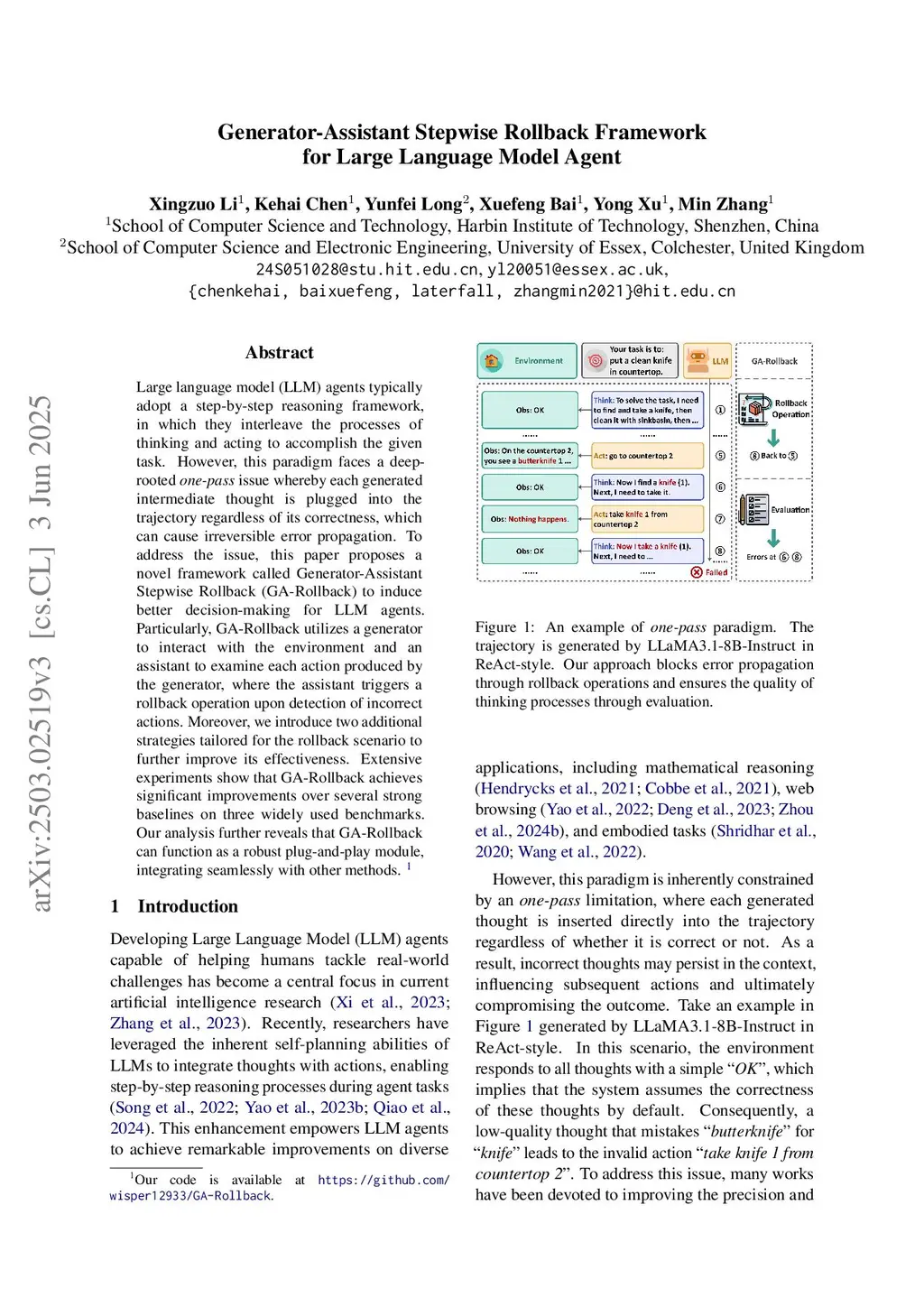 Large language model (LLM) agents typically adopt a step-by-step reasoning framework, in which they interleave the processes of thinking and acting to accomplish the given task. However, this paradigm faces a deep-rooted one-pass issue whereby each generated intermediate thought is plugged into the trajectory regardless of its correctness, which can cause irreversible error propagation. To address the issue, this paper proposes a novel framework called Generator-Assistant Stepwise Rollback (GA-Rollback) to induce better decision-making for LLM agents. Particularly, GA-Rollback utilizes a generator to interact with the environment and an assistant to examine each action produced by the generator, where the assistant triggers a rollback operation upon detection of incorrect actions. Moreover, we introduce two additional strategies tailored for the rollback scenario to further improve its effectiveness. Extensive experiments show that GA-Rollback achieves significant improvements over several strong baselines on three widely used benchmarks. Our analysis further reveals that GA-Rollback can function as a robust plug-and-play module, integrating seamlessly with other methods.