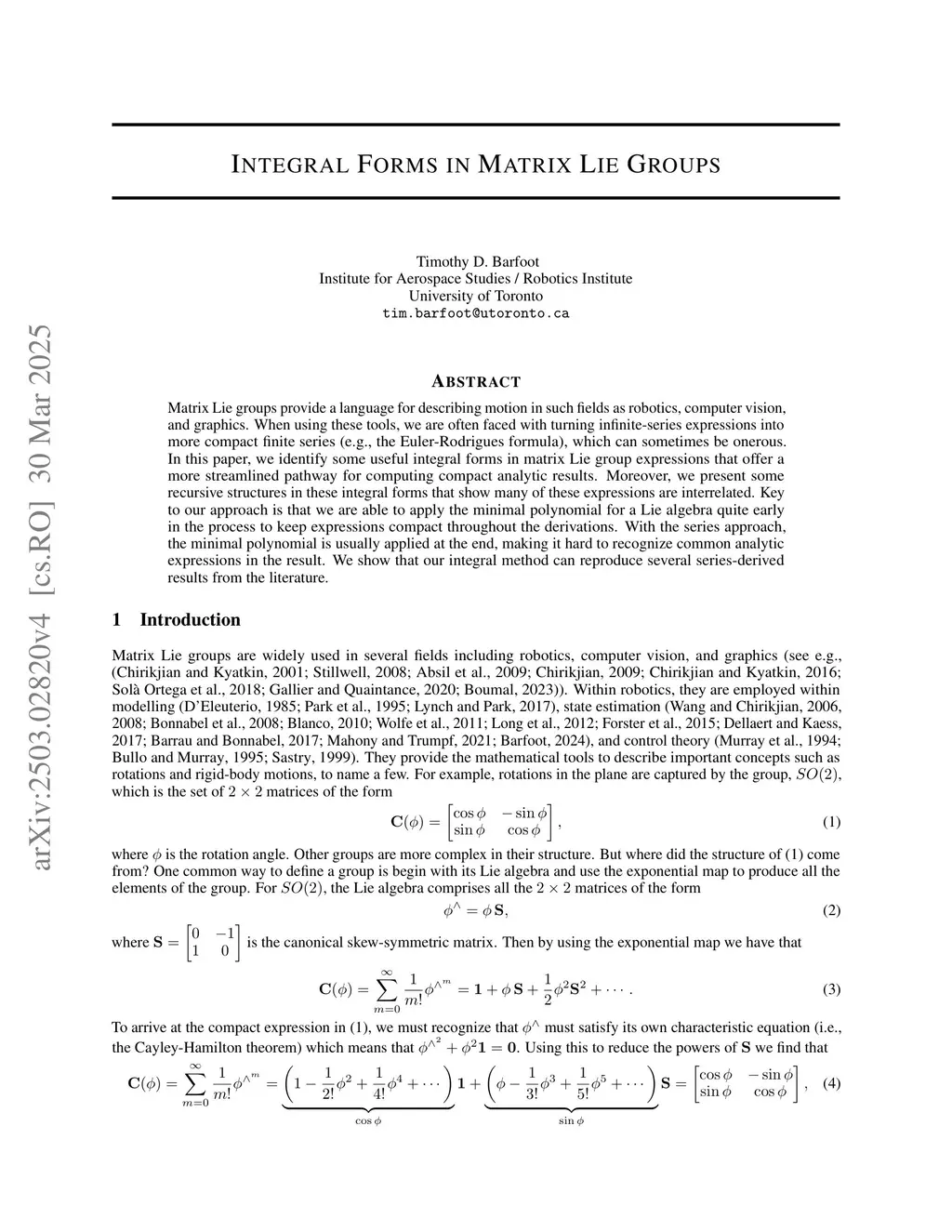 Matrix Lie groups provide a language for describing motion in such fields as robotics, computer vision, and graphics. When using these tools, we are often faced with turning infinite-series expressions into more compact finite series (e.g., the Euler-Rodrigues formula), which can sometimes be onerous. In this paper, we identify some useful integral forms in matrix Lie group expressions that offer a more streamlined pathway for computing compact analytic results. Moreover, we present some recursive structures in these integral forms that show many of these expressions are interrelated. Key to our approach is that we are able to apply the minimal polynomial for a Lie algebra quite early in the process to keep expressions compact throughout the derivations. With the series approach, the minimal polynomial is usually applied at the end, making it hard to recognize common analytic expressions in the result. We show that our integral method can reproduce several series-derived results from the literature.