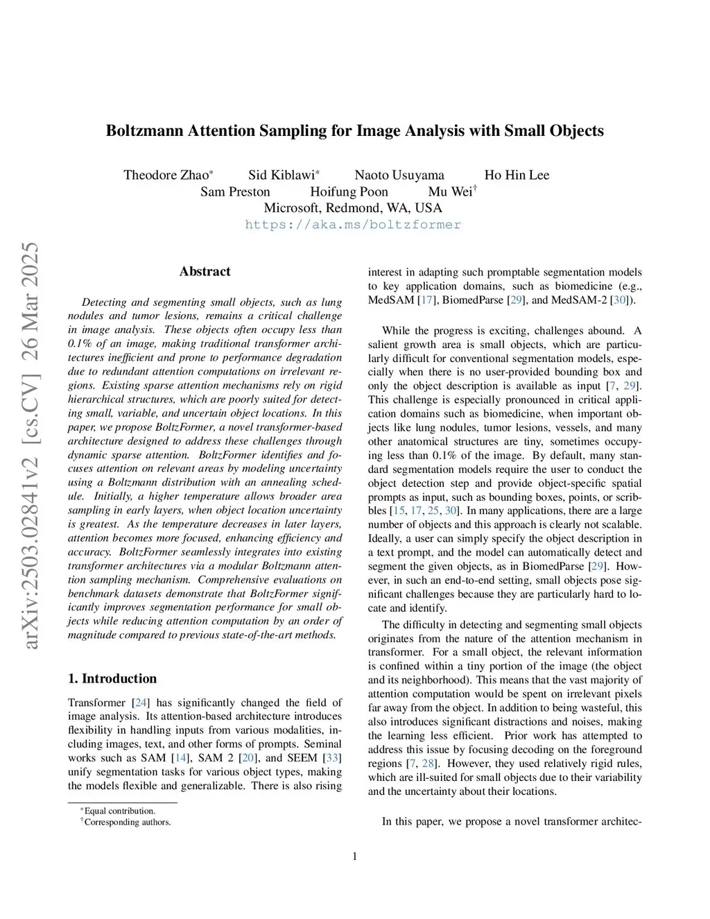 Detecting and segmenting small objects, such as lung nodules and tumor lesions, remains a critical challenge in image analysis. These objects often occupy less than 0.1% of an image, making traditional transformer architectures inefficient and prone to performance degradation due to redundant attention computations on irrelevant regions. Existing sparse attention mechanisms rely on rigid hierarchical structures, which are poorly suited for detecting small, variable, and uncertain object locations. In this paper, we propose BoltzFormer, a novel transformer-based architecture designed to address these challenges through dynamic sparse attention. BoltzFormer identifies and focuses attention on relevant areas by modeling uncertainty using a Boltzmann distribution with an annealing schedule. Initially, a higher temperature allows broader area sampling in early layers, when object location uncertainty is greatest. As the temperature decreases in later layers, attention becomes more focused, enhancing efficiency and accuracy. BoltzFormer seamlessly integrates into existing transformer architectures via a modular Boltzmann attention sampling mechanism. Comprehensive evaluations on benchmark datasets demonstrate that BoltzFormer significantly improves segmentation performance for small objects while reducing attention computation by an order of magnitude compared to previous state-of-the-art methods.