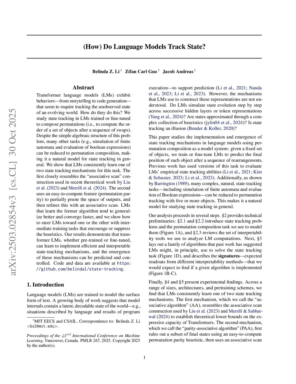 Transformer language models (LMs) exhibit behaviors -- from storytelling to code generation -- that seem to require tracking the unobserved state of an evolving world. How do they do this? We study state tracking in LMs trained or fine-tuned to compose permutations (i.e., to compute the order of a set of objects after a sequence of swaps). Despite the simple algebraic structure of this problem, many other tasks (e.g., simulation of finite automata and evaluation of boolean expressions) can be reduced to permutation composition, making it a natural model for state tracking in general. We show that LMs consistently learn one of two state tracking mechanisms for this task. The first closely resembles the "associative scan" construction used in recent theoretical work by Liu et al. (2023) and Merrill et al. (2024). The second uses an easy-to-compute feature (permutation parity) to partially prune the space of outputs, and then refines this with an associative scan. LMs that learn the former algorithm tend to generalize better and converge faster, and we show how to steer LMs toward one or the other with intermediate training tasks that encourage or suppress the heuristics. Our results demonstrate that transformer LMs, whether pre-trained or fine-tuned, can learn to implement efficient and interpretable state-tracking mechanisms, and the emergence of these mechanisms can be predicted and controlled.