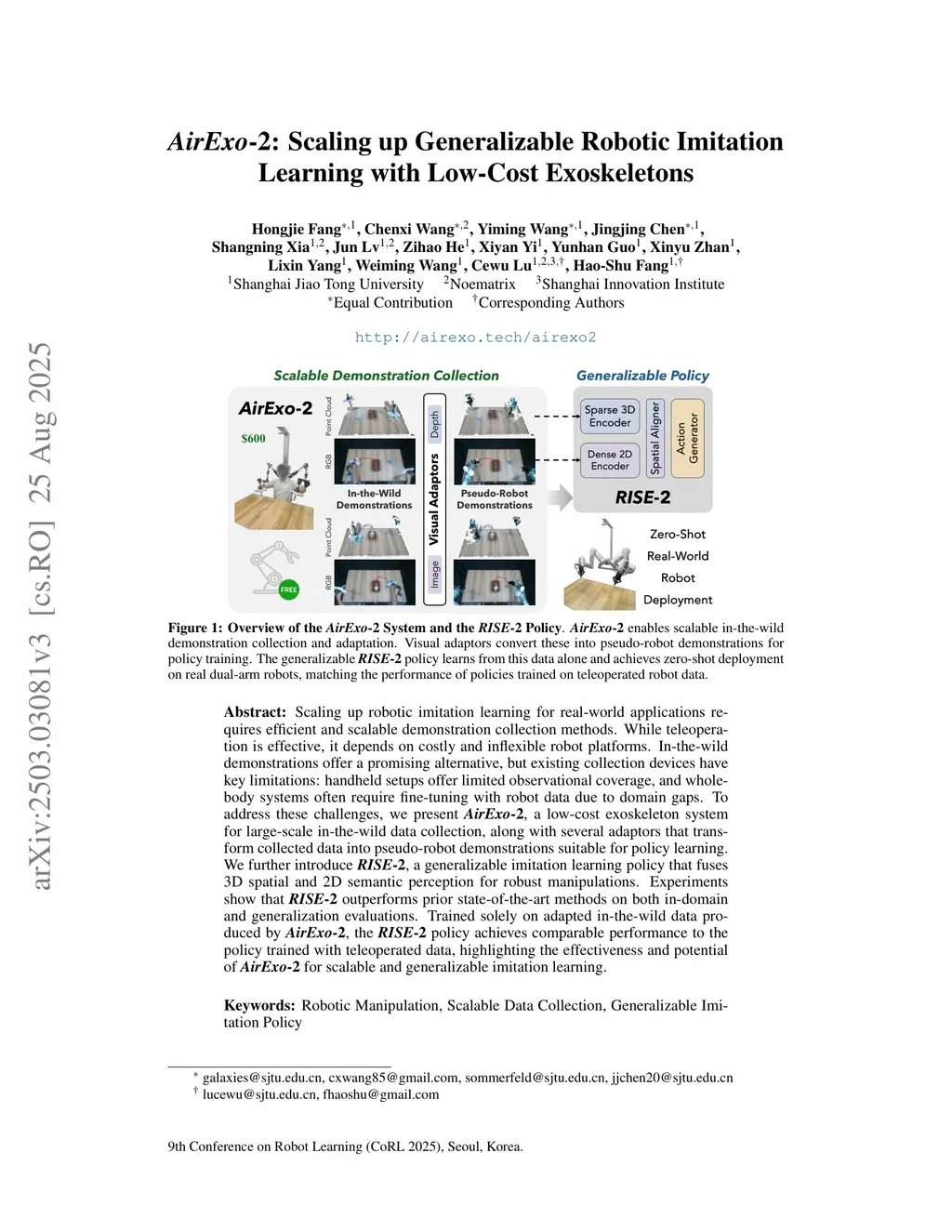 Scaling up robotic imitation learning for real-world applications requires efficient and scalable demonstration collection methods. While teleoperation is effective, it depends on costly and inflexible robot platforms. In-the-wild demonstrations offer a promising alternative, but existing collection devices have key limitations: handheld setups offer limited observational coverage, and whole-body systems often require fine-tuning with robot data due to domain gaps. To address these challenges, we present AirExo-2, a low-cost exoskeleton system for large-scale in-the-wild data collection, along with several adaptors that transform collected data into pseudo-robot demonstrations suitable for policy learning. We further introduce RISE-2, a generalizable imitation learning policy that fuses 3D spatial and 2D semantic perception for robust manipulations. Experiments show that RISE-2 outperforms prior state-of-the-art methods on both in-domain and generalization evaluations. Trained solely on adapted in-the-wild data produced by AirExo-2, the RISE-2 policy achieves comparable performance to the policy trained with teleoperated data, highlighting the effectiveness and potential of AirExo-2 for scalable and generalizable imitation learning.