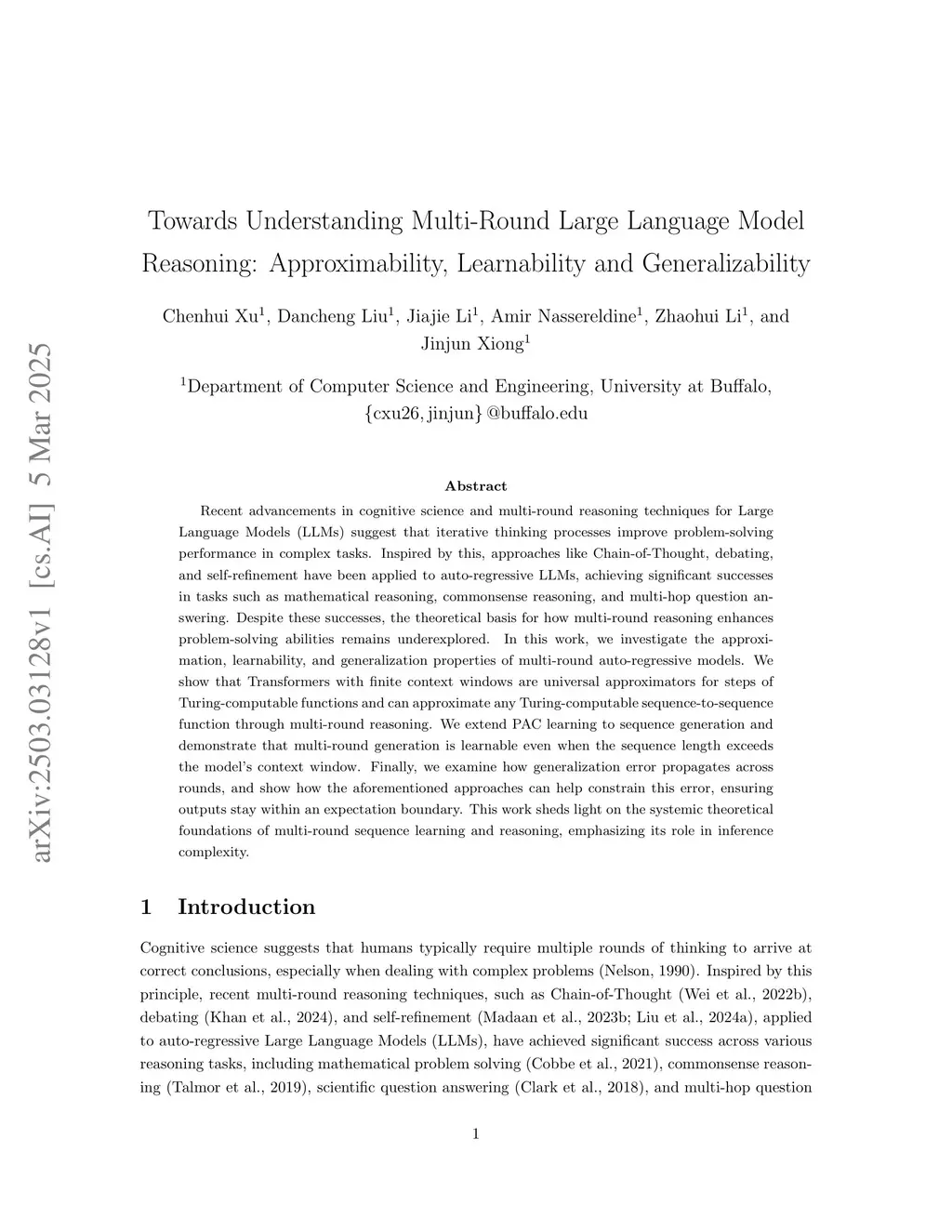 Recent advancements in cognitive science and multi-round reasoning techniques for Large Language Models (LLMs) suggest that iterative thinking processes improve problem-solving performance in complex tasks. Inspired by this, approaches like Chain-of-Thought, debating, and self-refinement have been applied to auto-regressive LLMs, achieving significant successes in tasks such as mathematical reasoning, commonsense reasoning, and multi-hop question answering. Despite these successes, the theoretical basis for how multi-round reasoning enhances problem-solving abilities remains underexplored. In this work, we investigate the approximation, learnability, and generalization properties of multi-round auto-regressive models. We show that Transformers with finite context windows are universal approximators for steps of Turing-computable functions and can approximate any Turing-computable sequence-to-sequence function through multi-round reasoning. We extend PAC learning to sequence generation and demonstrate that multi-round generation is learnable even when the sequence length exceeds the model's context window. Finally, we examine how generalization error propagates across rounds, and show how the aforementioned approaches can help constrain this error, ensuring outputs stay within an expectation boundary. This work sheds light on the systemic theoretical foundations of multi-round sequence learning and reasoning, emphasizing its role in inference complexity.