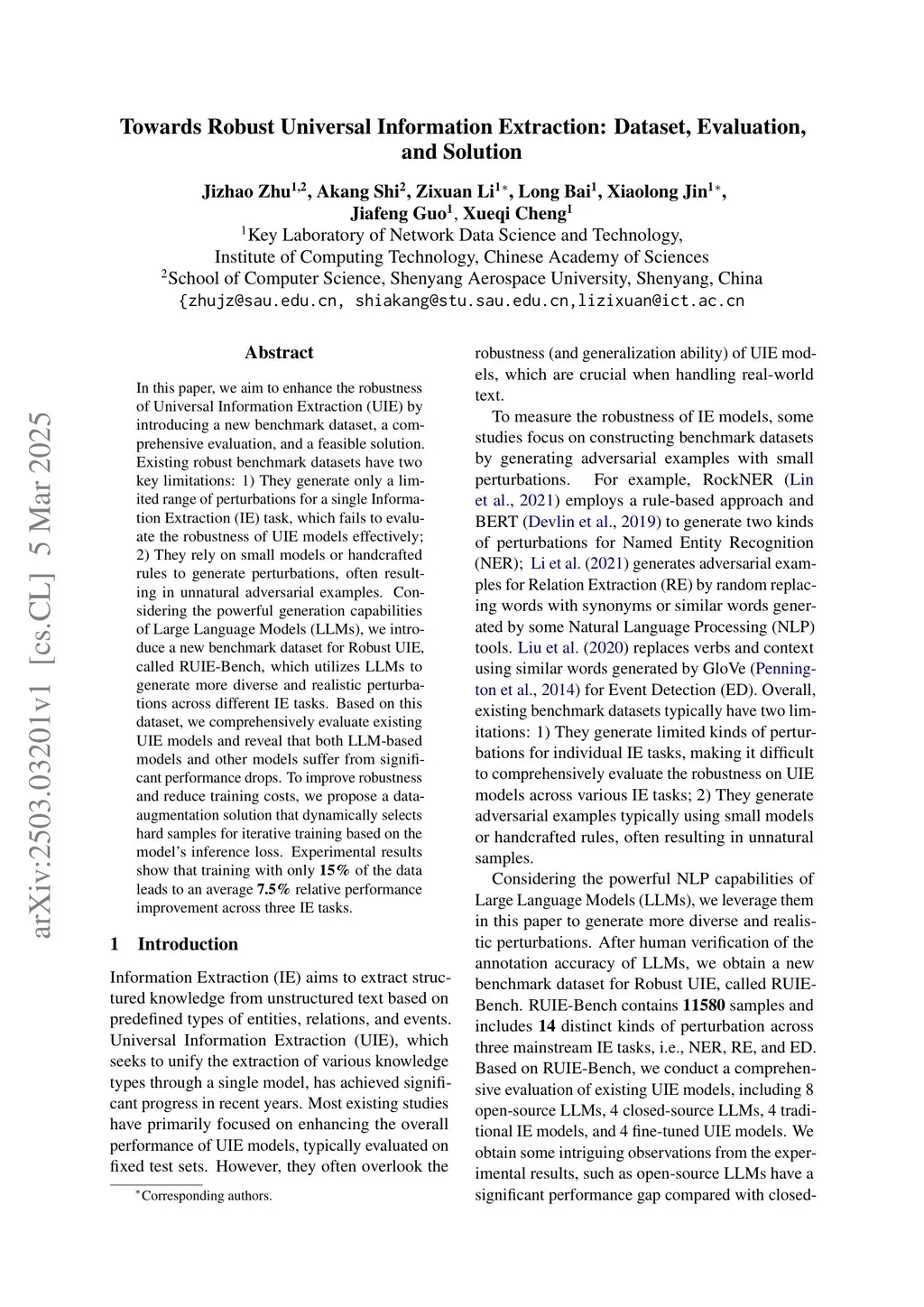 In this paper, we aim to enhance the robustness of Universal Information Extraction (UIE) by introducing a new benchmark dataset, a comprehensive evaluation, and a feasible solution. Existing robust benchmark datasets have two key limitations: 1) They generate only a limited range of perturbations for a single Information Extraction (IE) task, which fails to evaluate the robustness of UIE models effectively; 2) They rely on small models or handcrafted rules to generate perturbations, often resulting in unnatural adversarial examples. Considering the powerful generation capabilities of Large Language Models (LLMs), we introduce a new benchmark dataset for Robust UIE, called RUIE-Bench, which utilizes LLMs to generate more diverse and realistic perturbations across different IE tasks. Based on this dataset, we comprehensively evaluate existing UIE models and reveal that both LLM-based models and other models suffer from significant performance drops. To improve robustness and reduce training costs, we propose a data-augmentation solution that dynamically selects hard samples for iterative training based on the model's inference loss. Experimental results show that training with only \textbf{15\%} of the data leads to an average \textbf{7.5\%} relative performance improvement across three IE tasks.